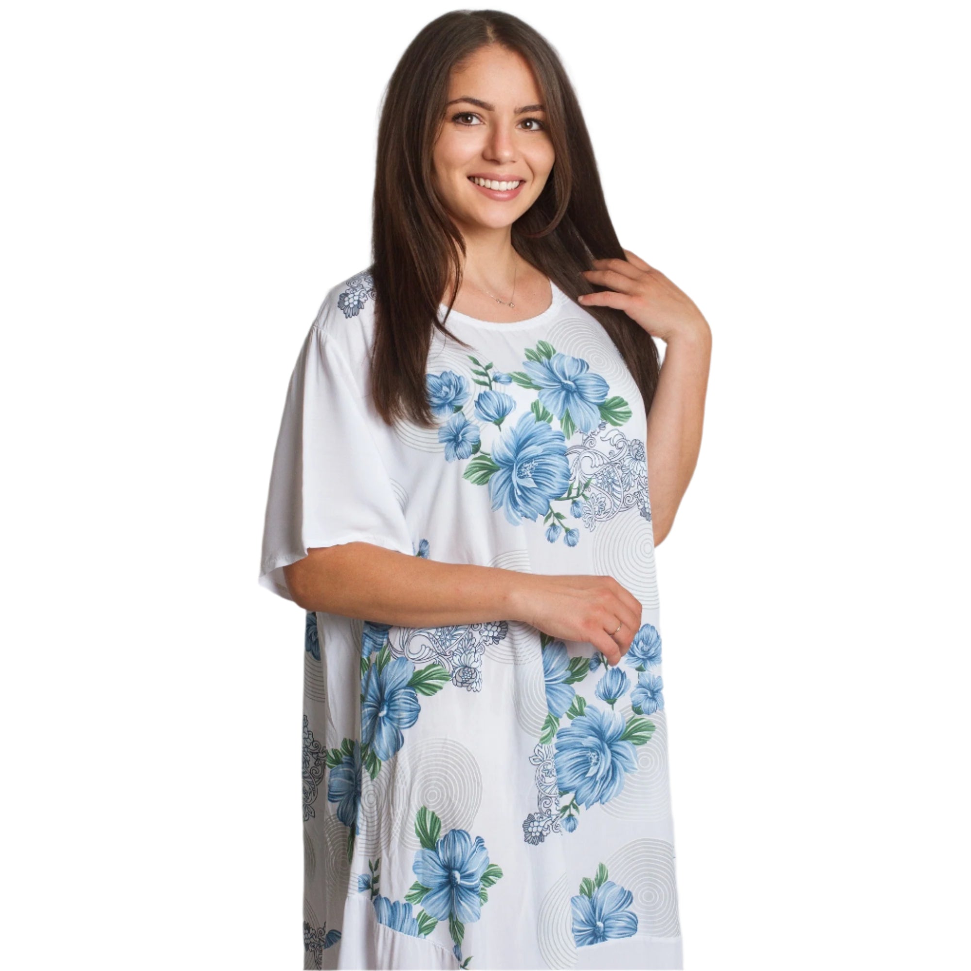 Λευκό αέρινο φόρεμα με μπλε φλοράλ μοτίβα