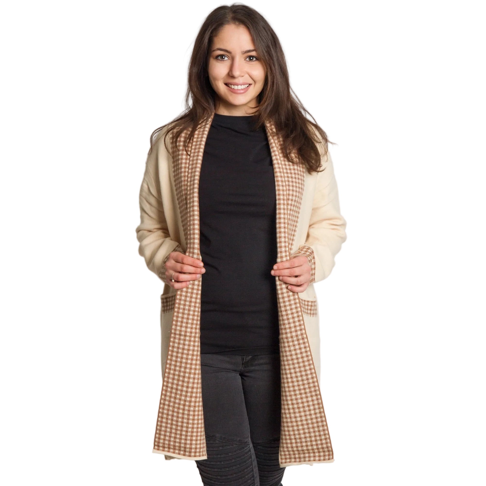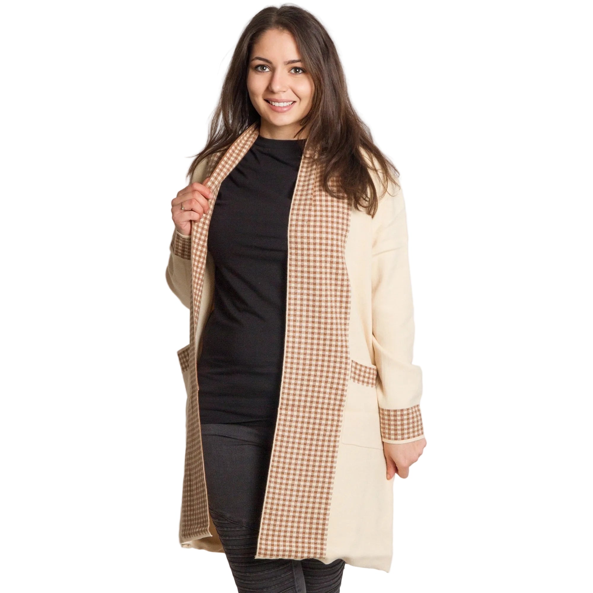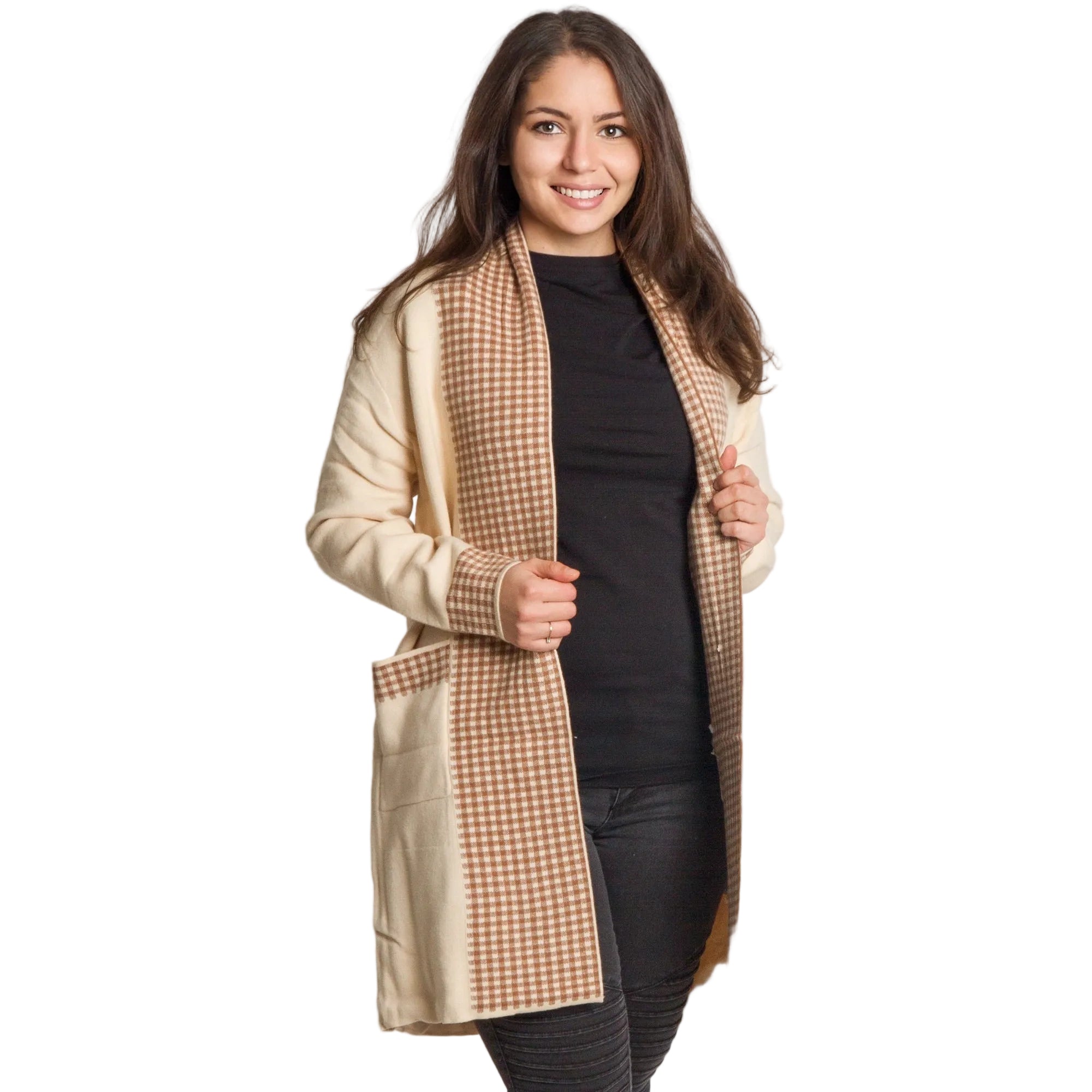 Μπεζ ζακέτα χωρίς κουμπιά με τσέπες και καρό λεπτομέρειες