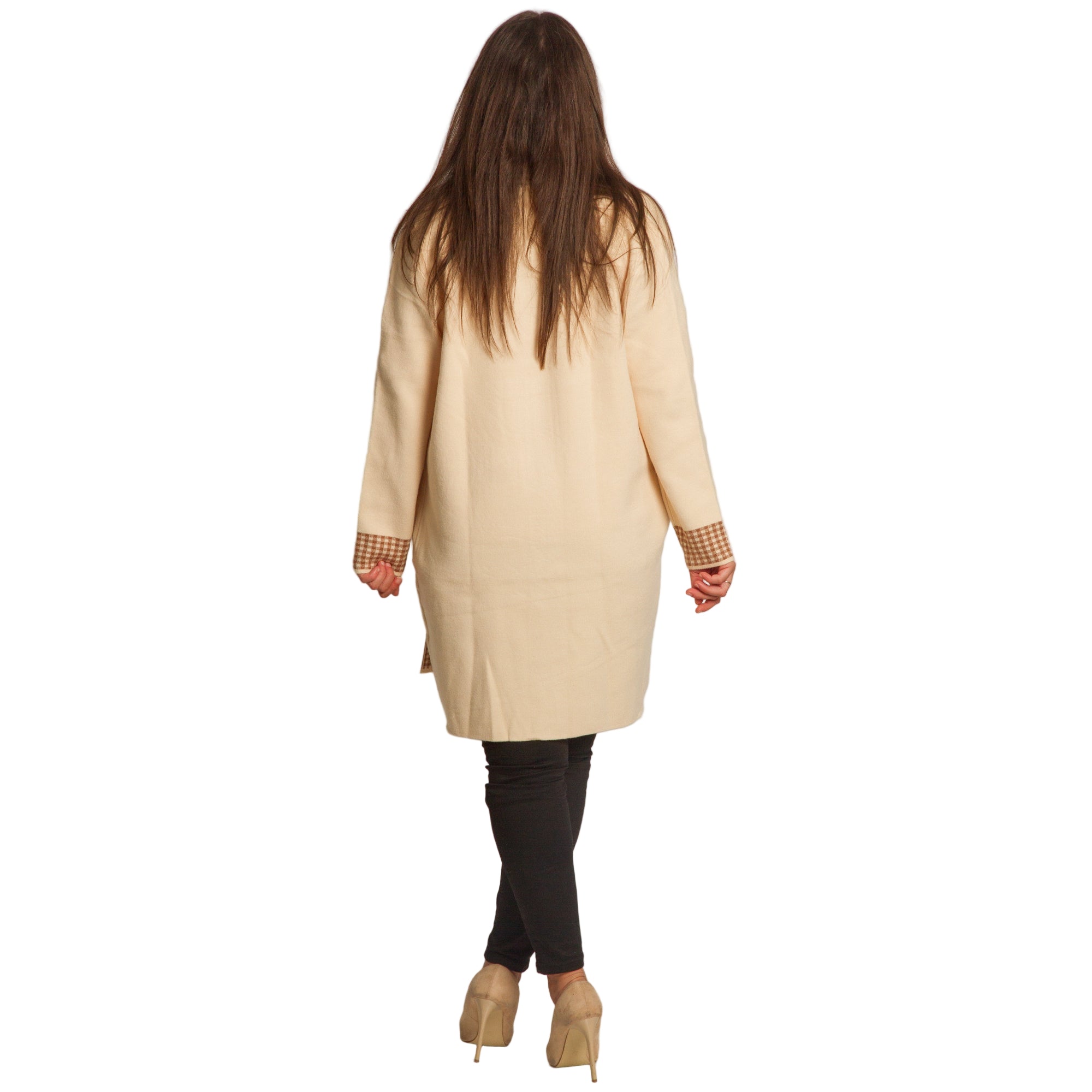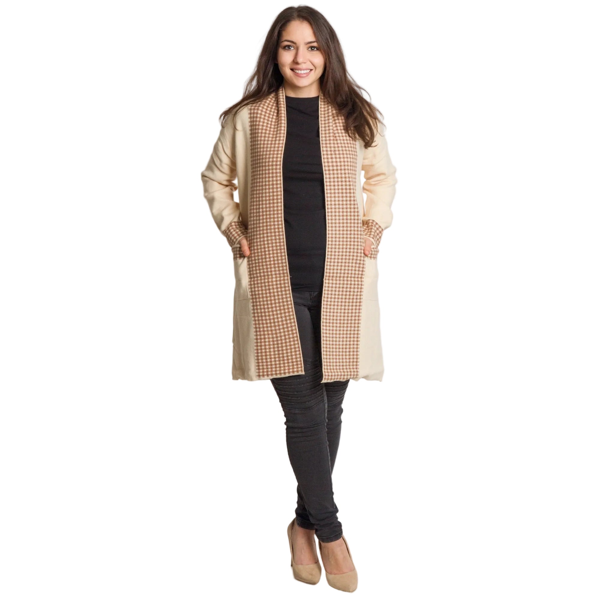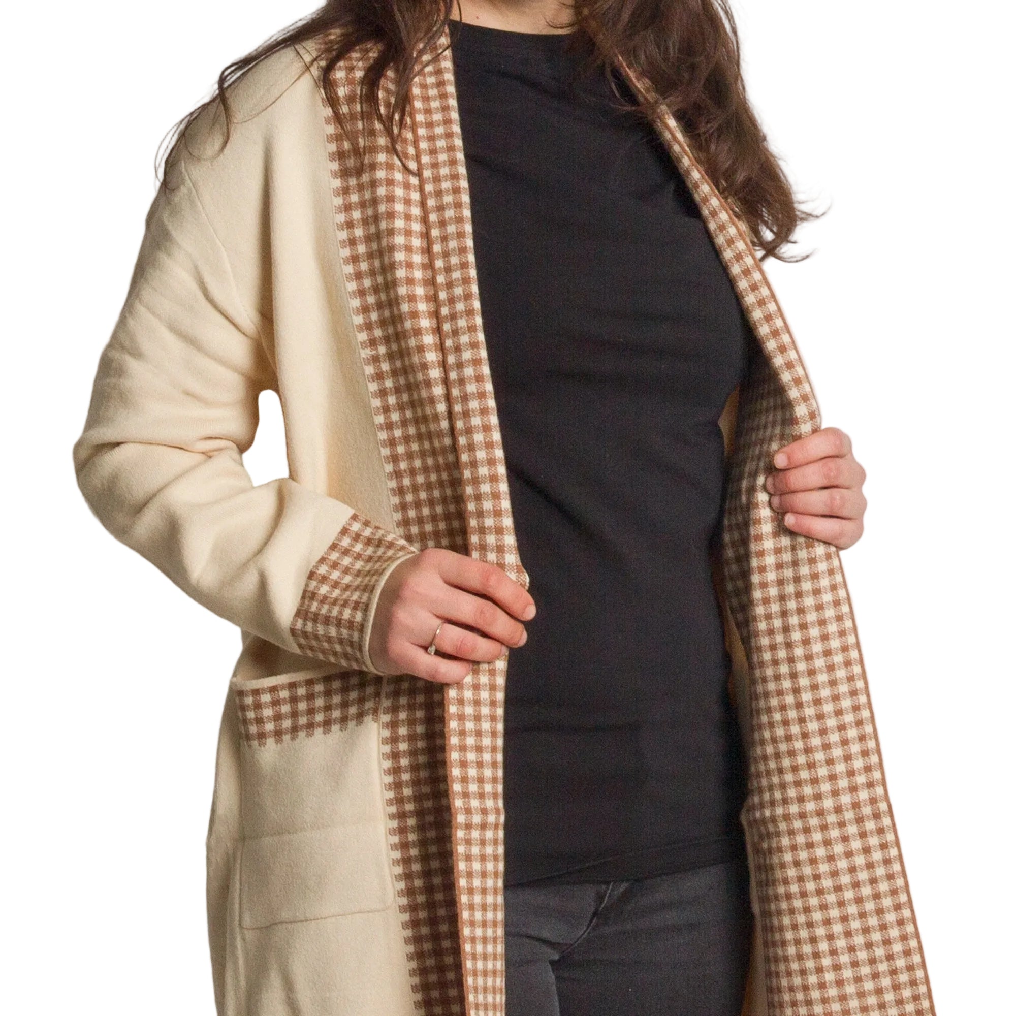 Μπεζ ζακέτα χωρίς κουμπιά με τσέπες και καρό λεπτομέρειες