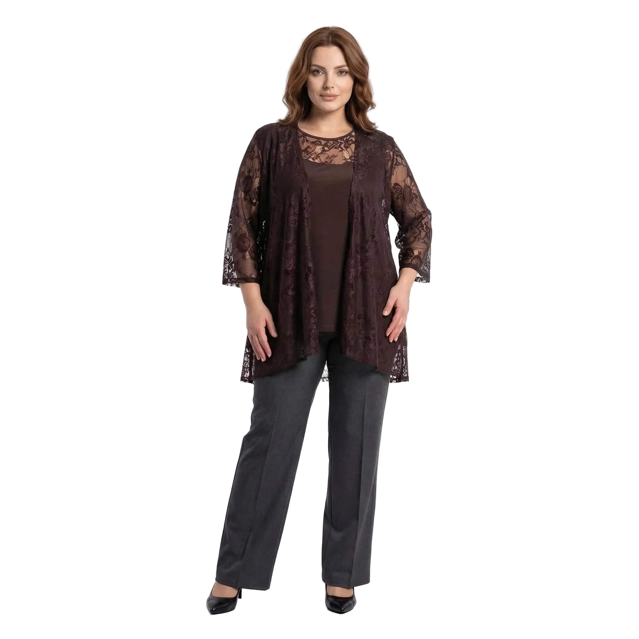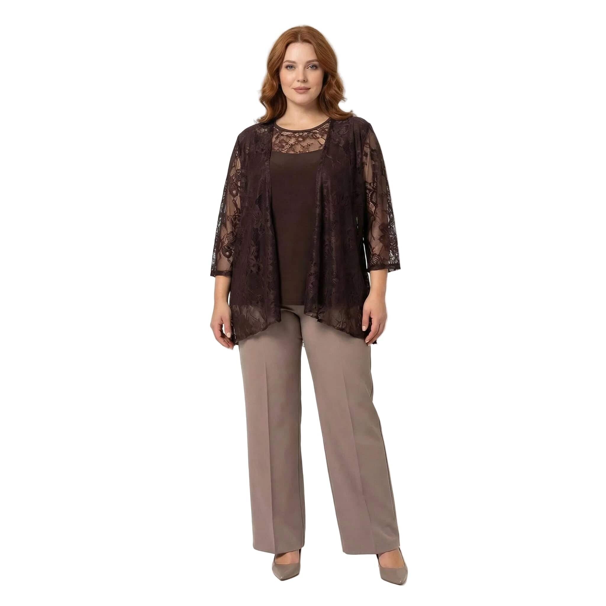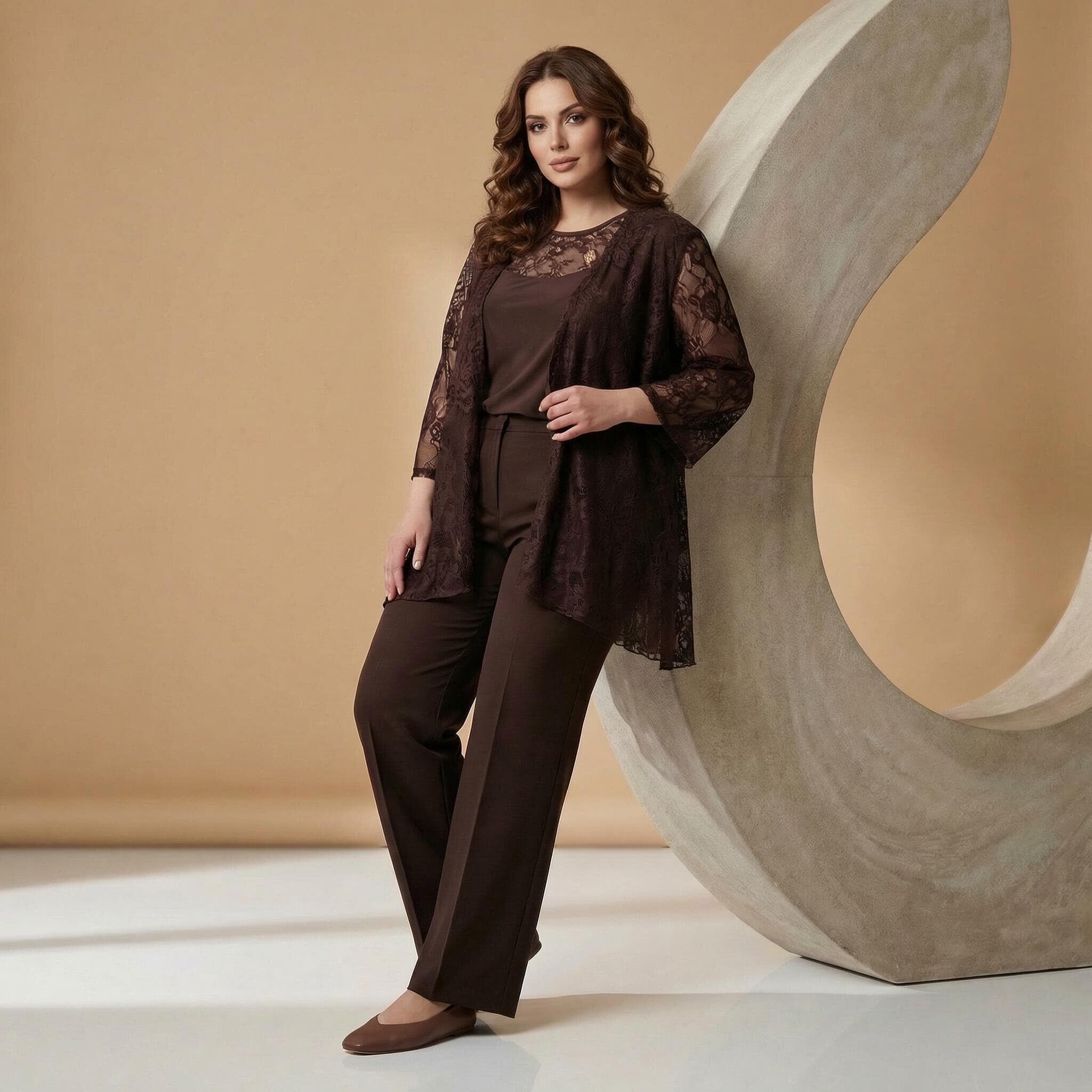 Επίσημο καφέ γυναικείο σετ δύο τεμαχίων με δαντέλα plus size