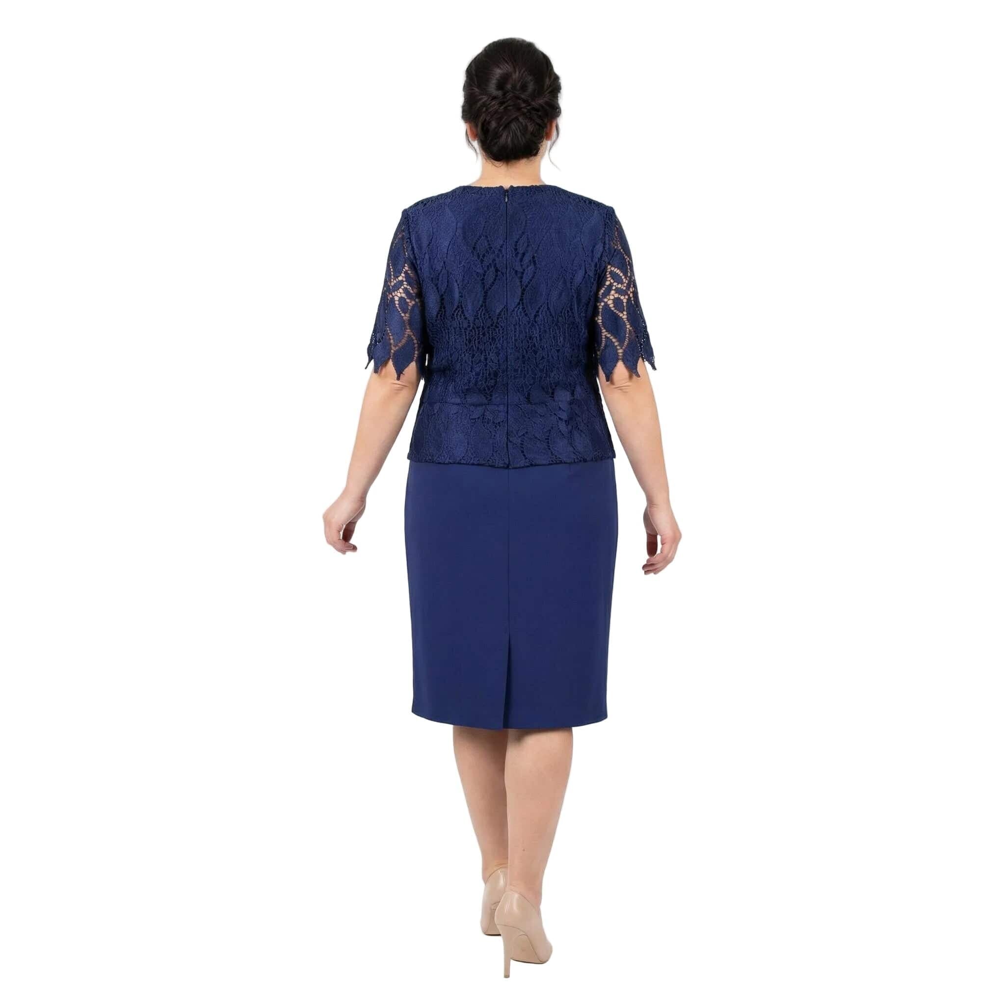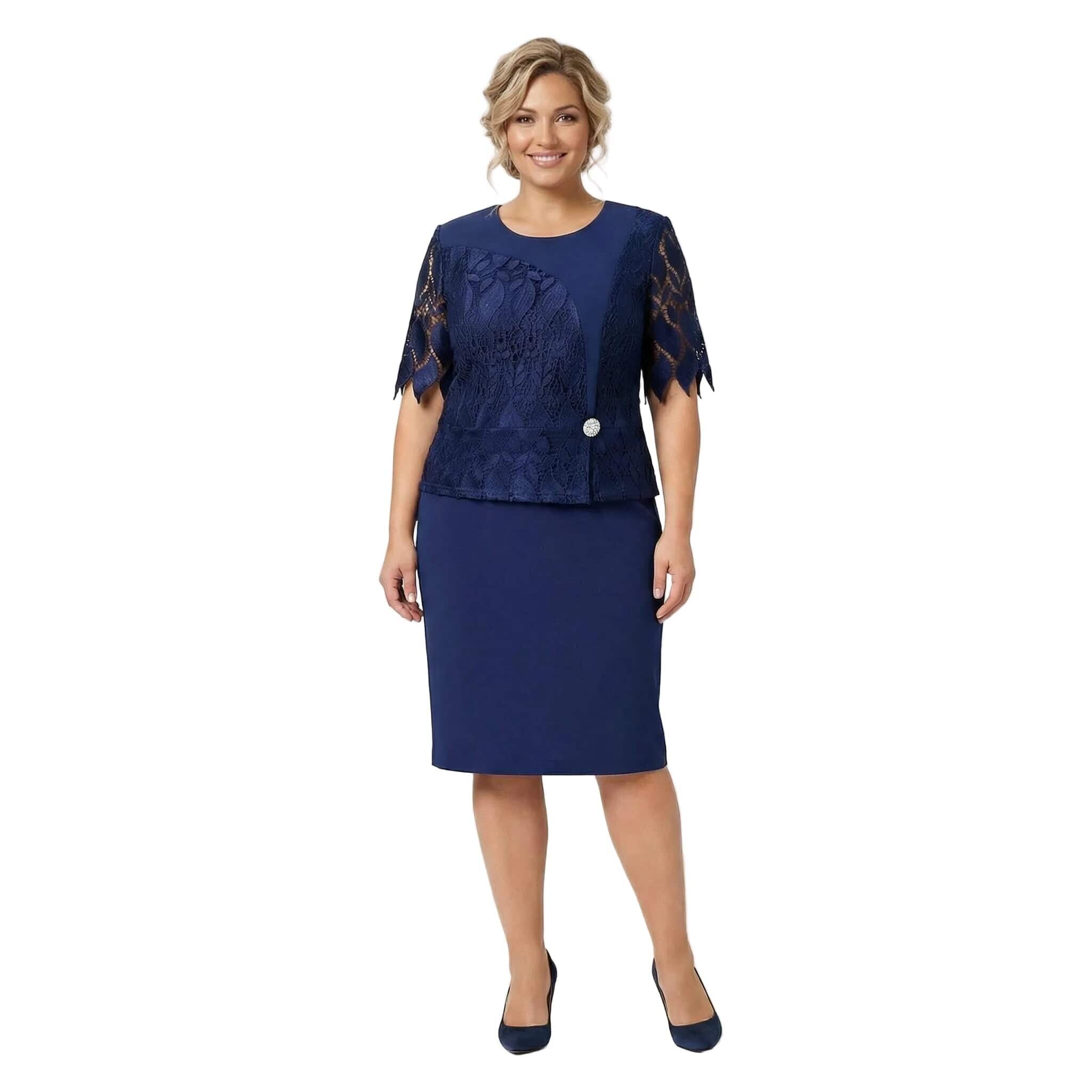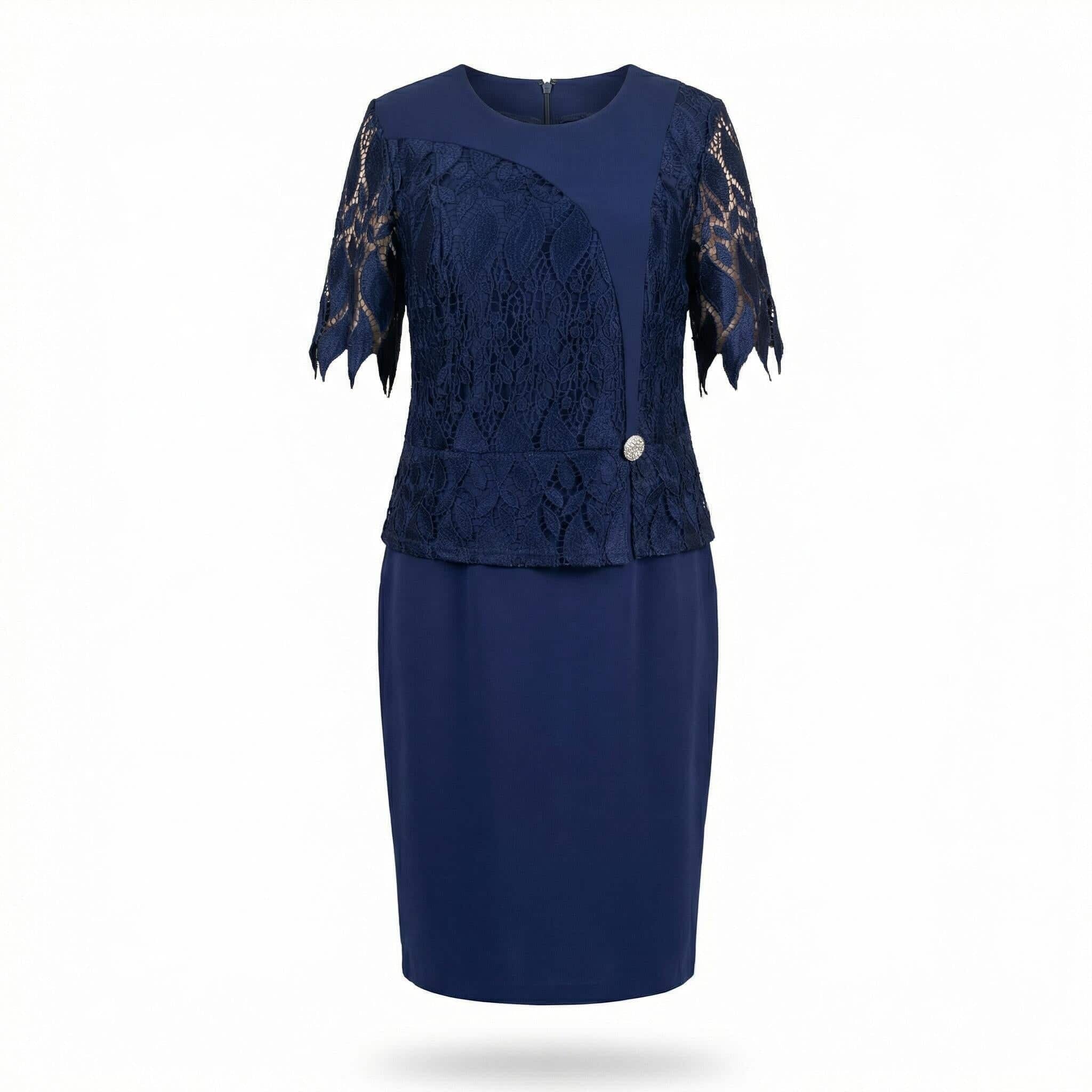 Επίσημο μπλε φόρεμα σε ίσια γραμμή με δαντέλα και διακοσμητική καρφίτσα