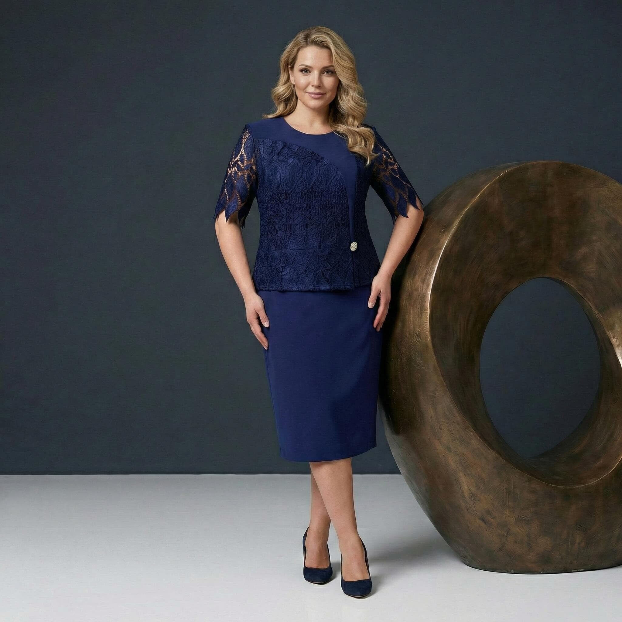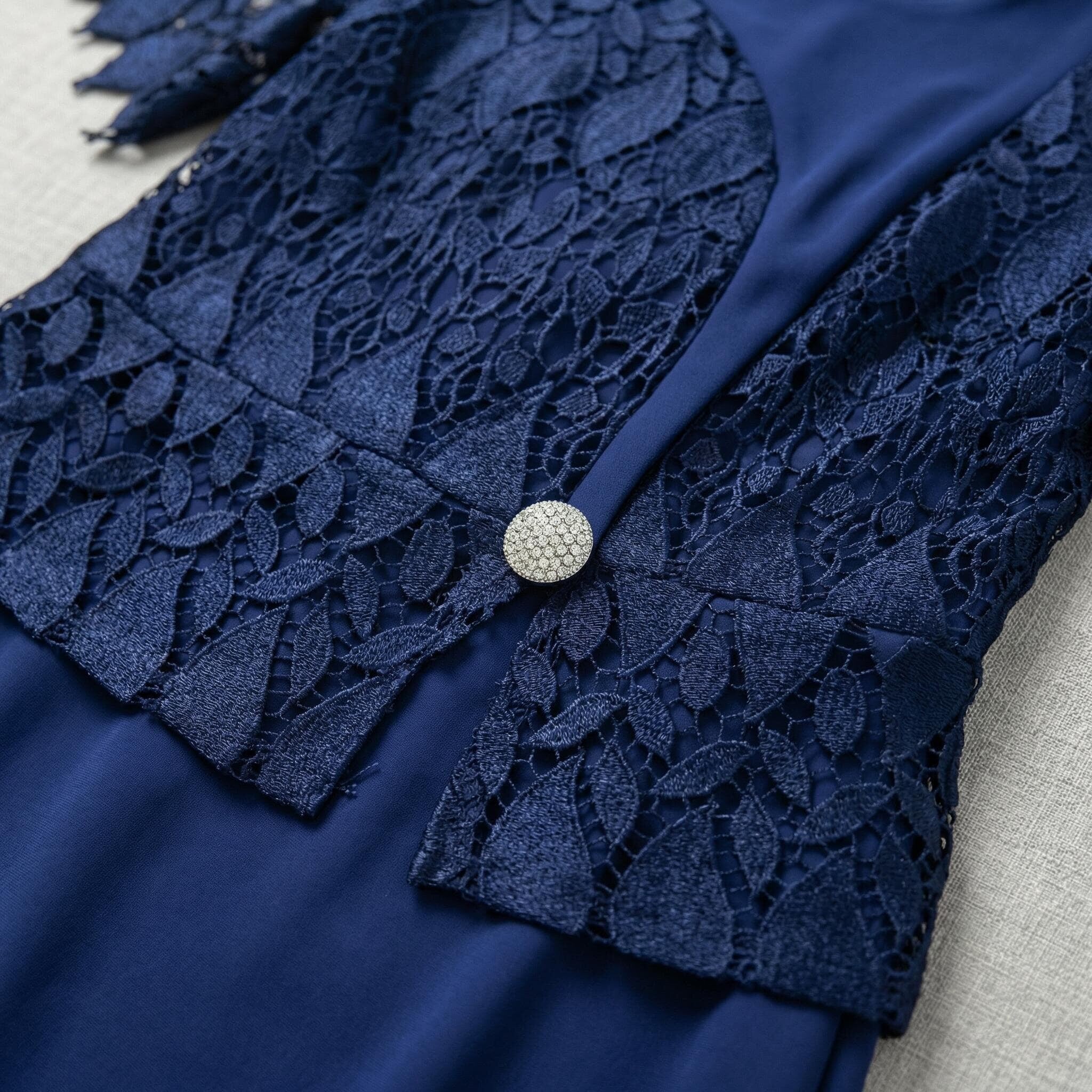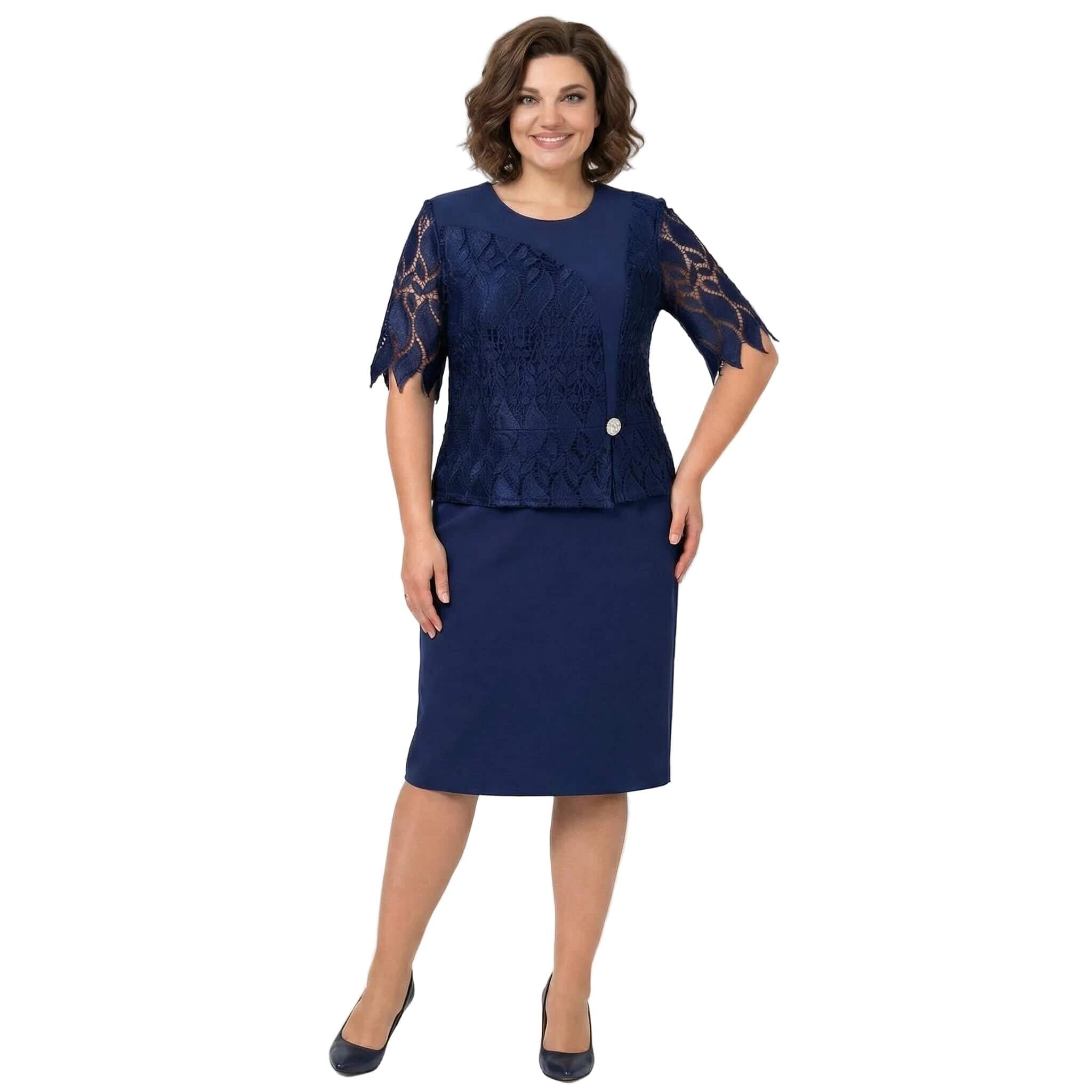 Επίσημο μπλε φόρεμα σε ίσια γραμμή με δαντέλα και διακοσμητική καρφίτσα