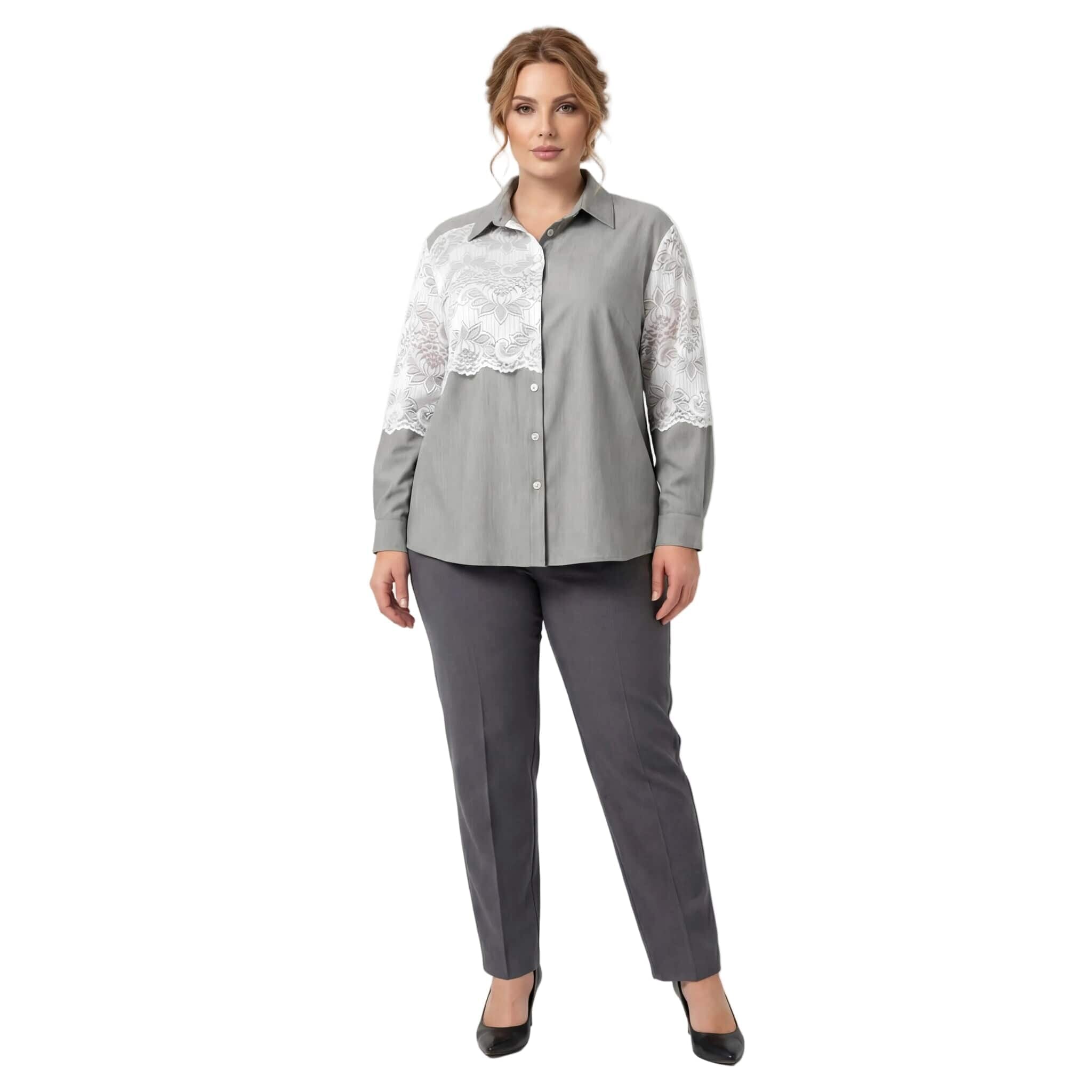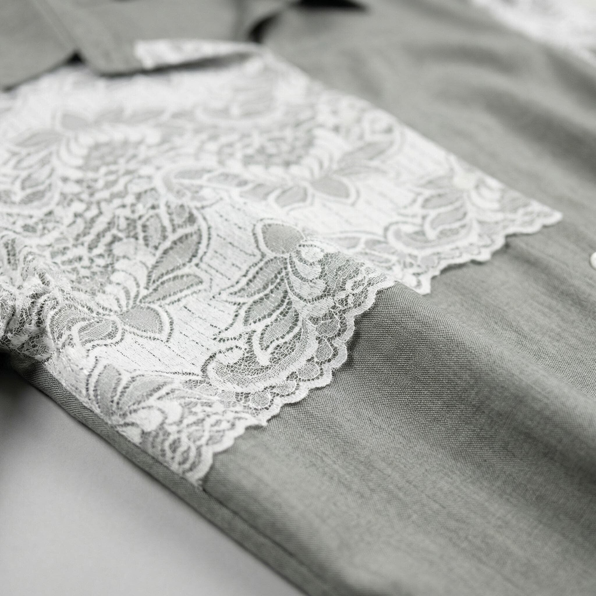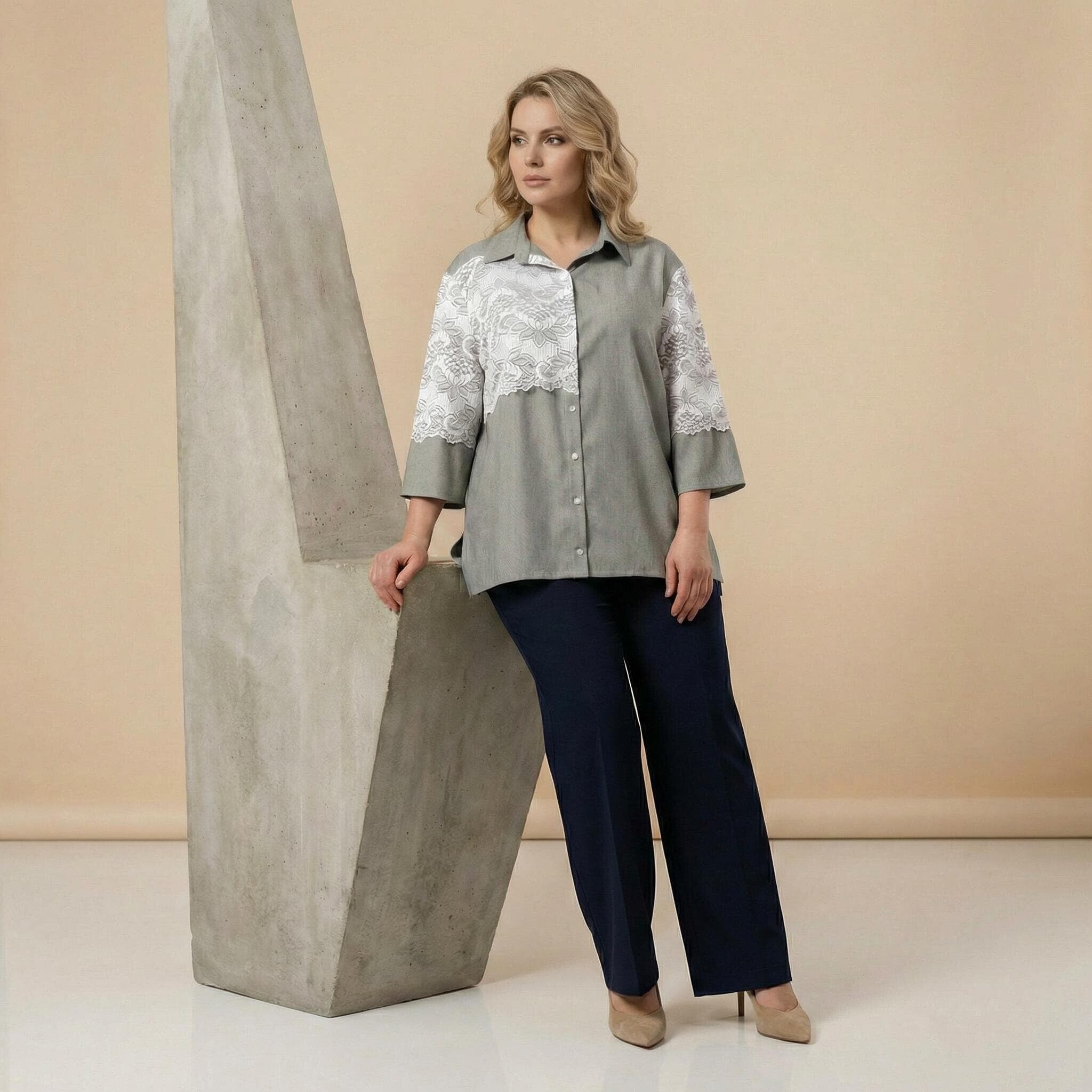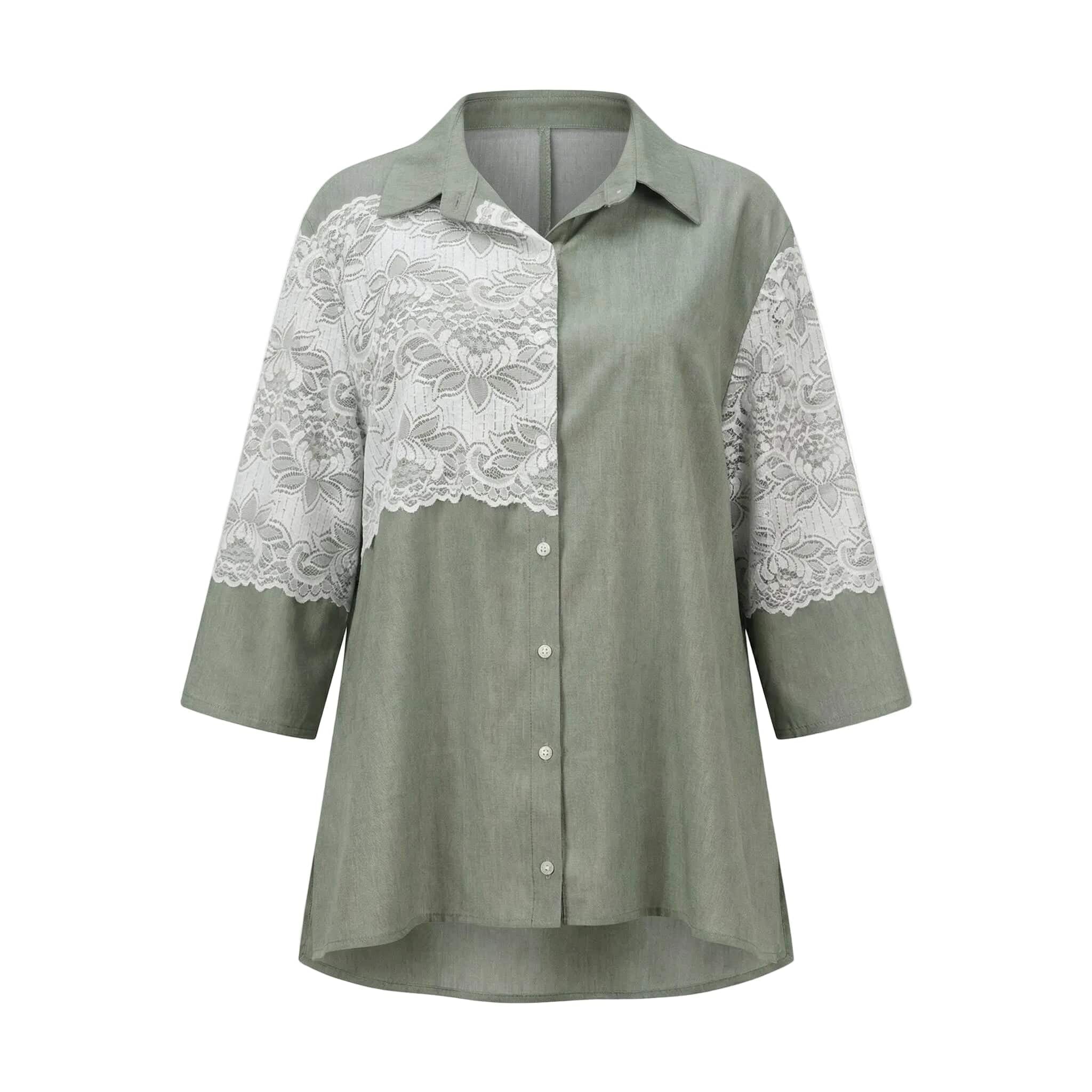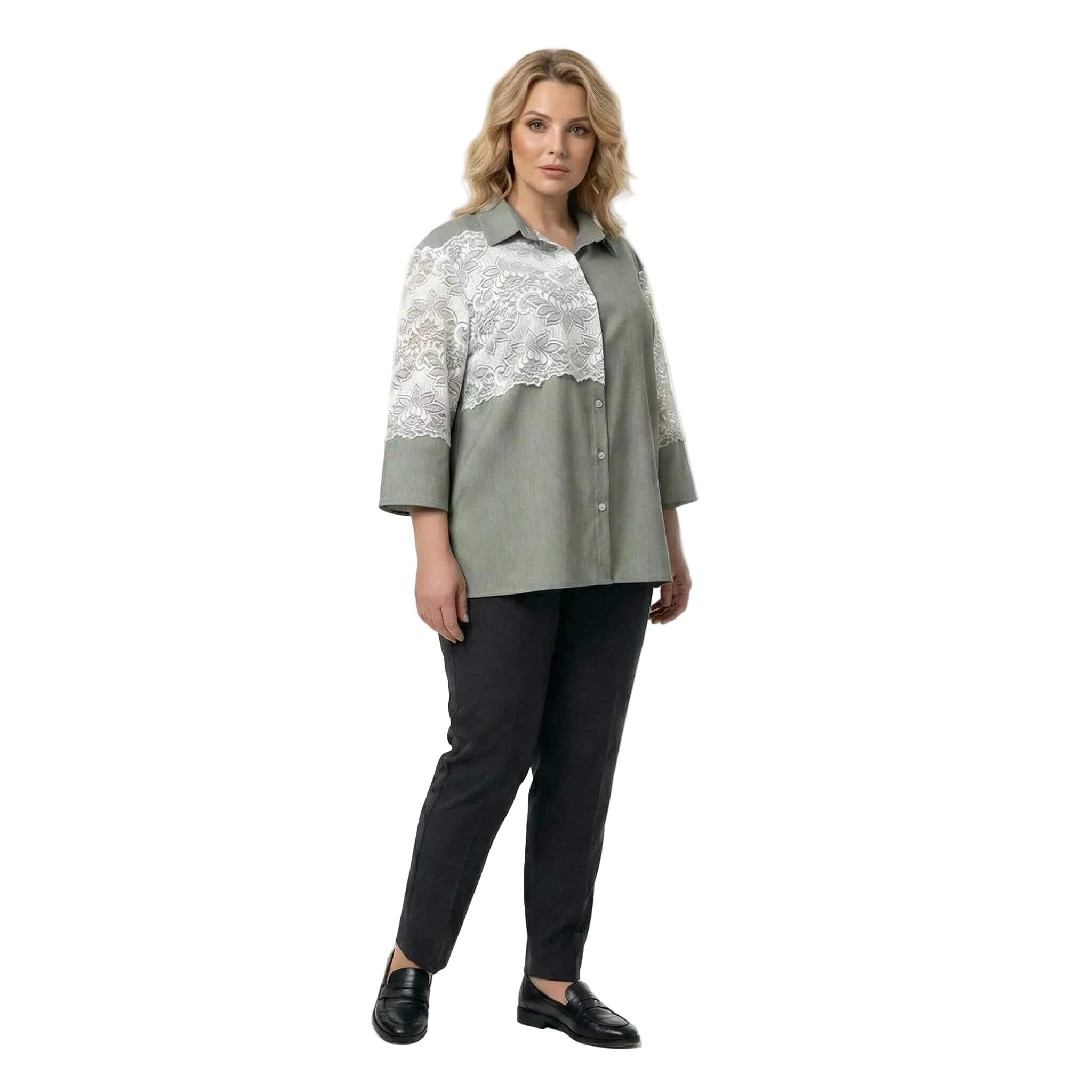 Επίσημο χακί λινό πουκάμισο με λευκή δαντέλα σε μεγάλα μεγέθη
