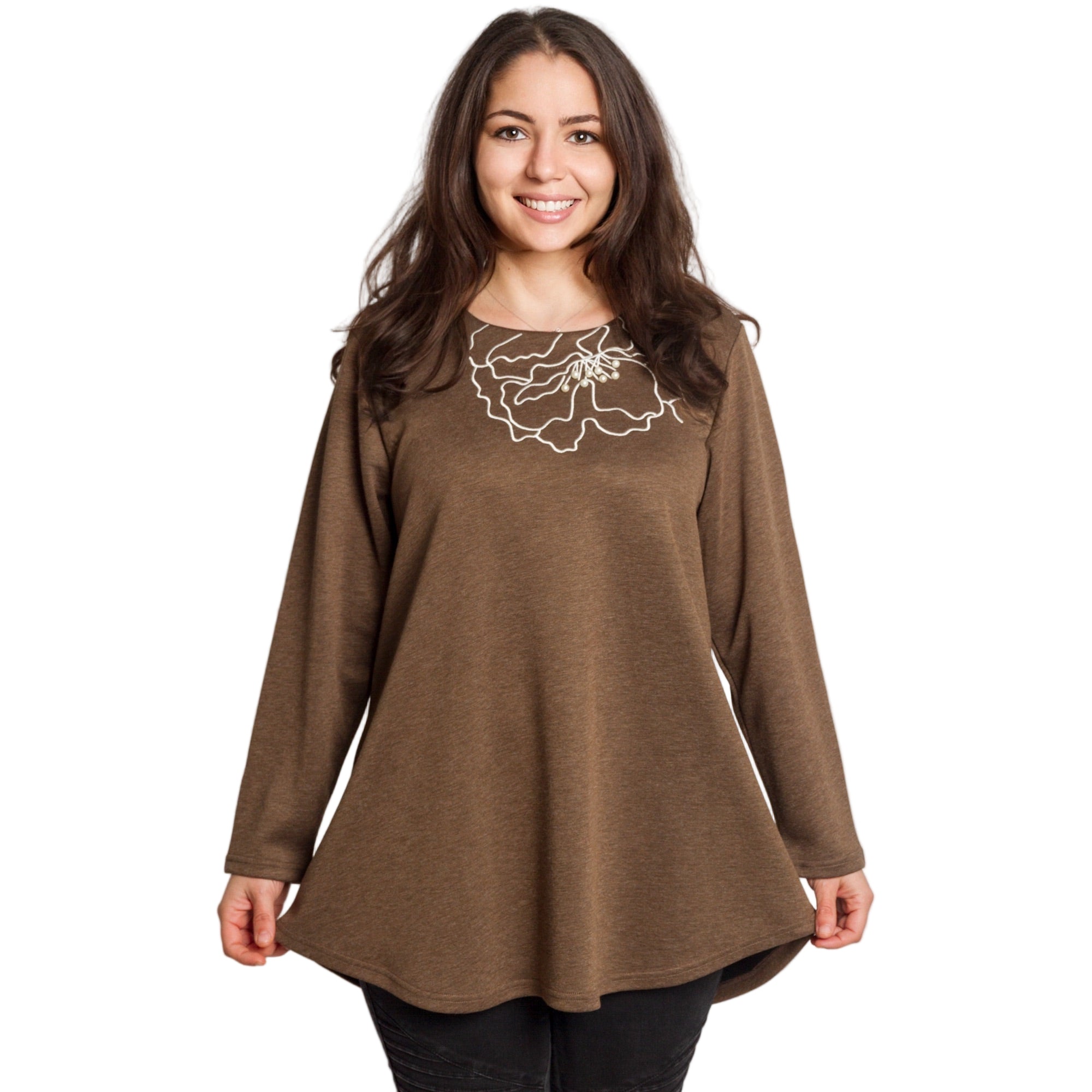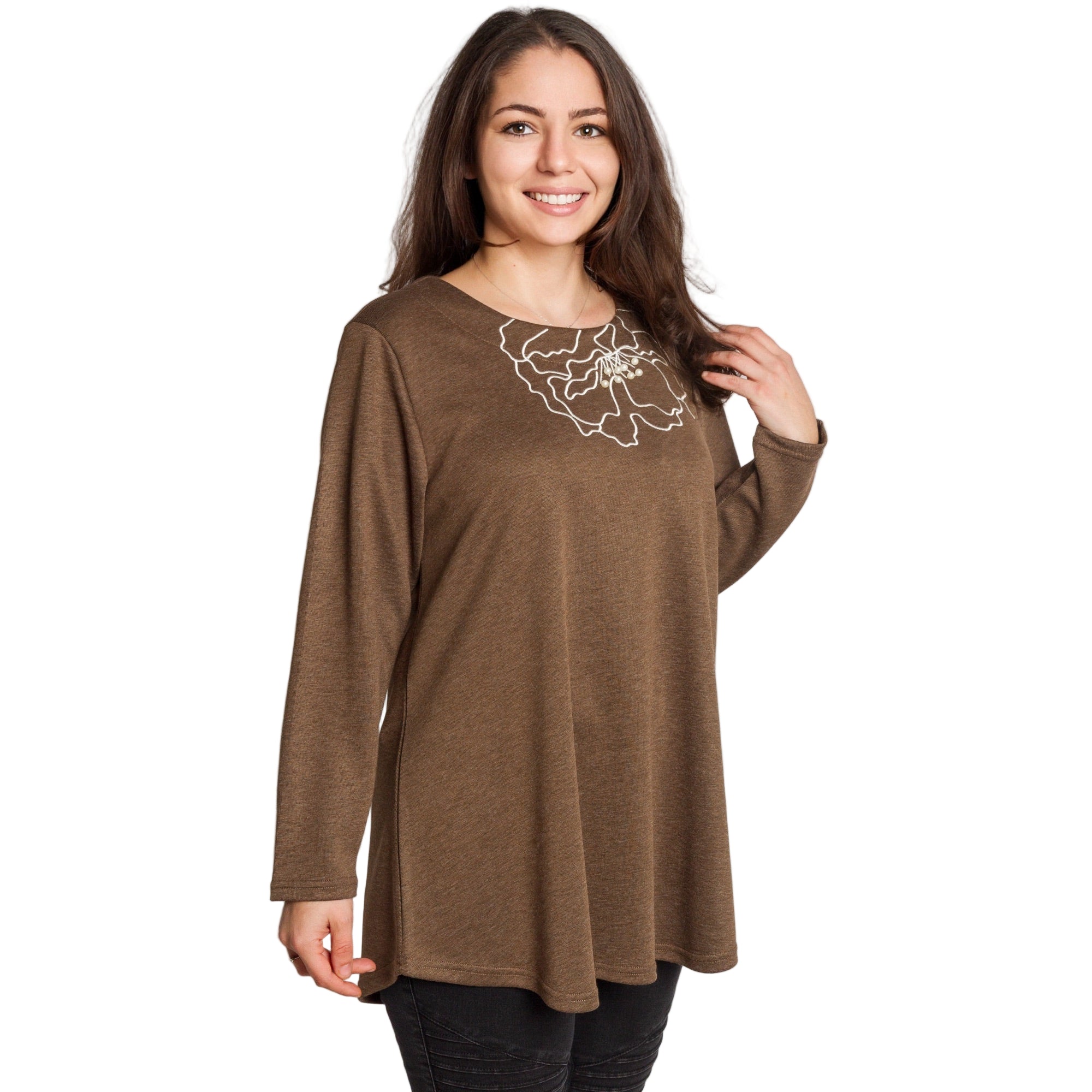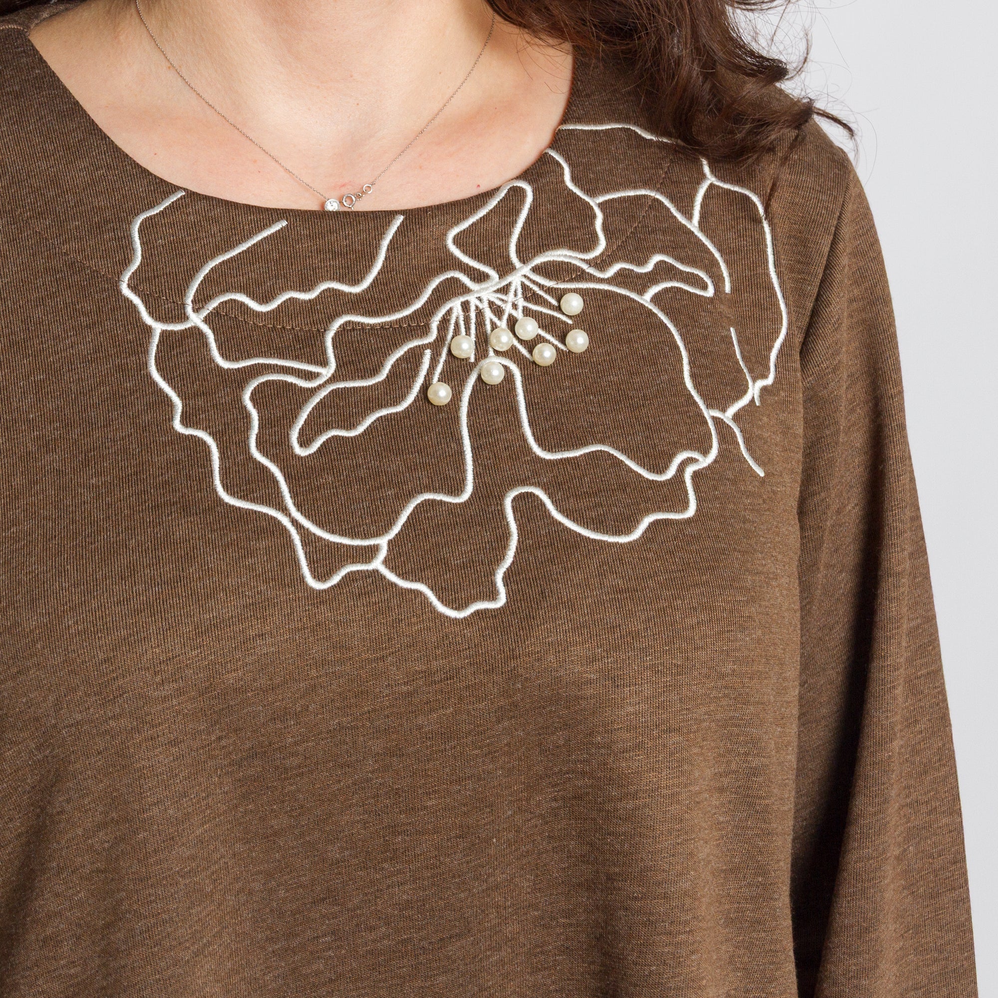 Καφέ άνετη τουνίκ με φλοράλ κέντημα και πέρλες