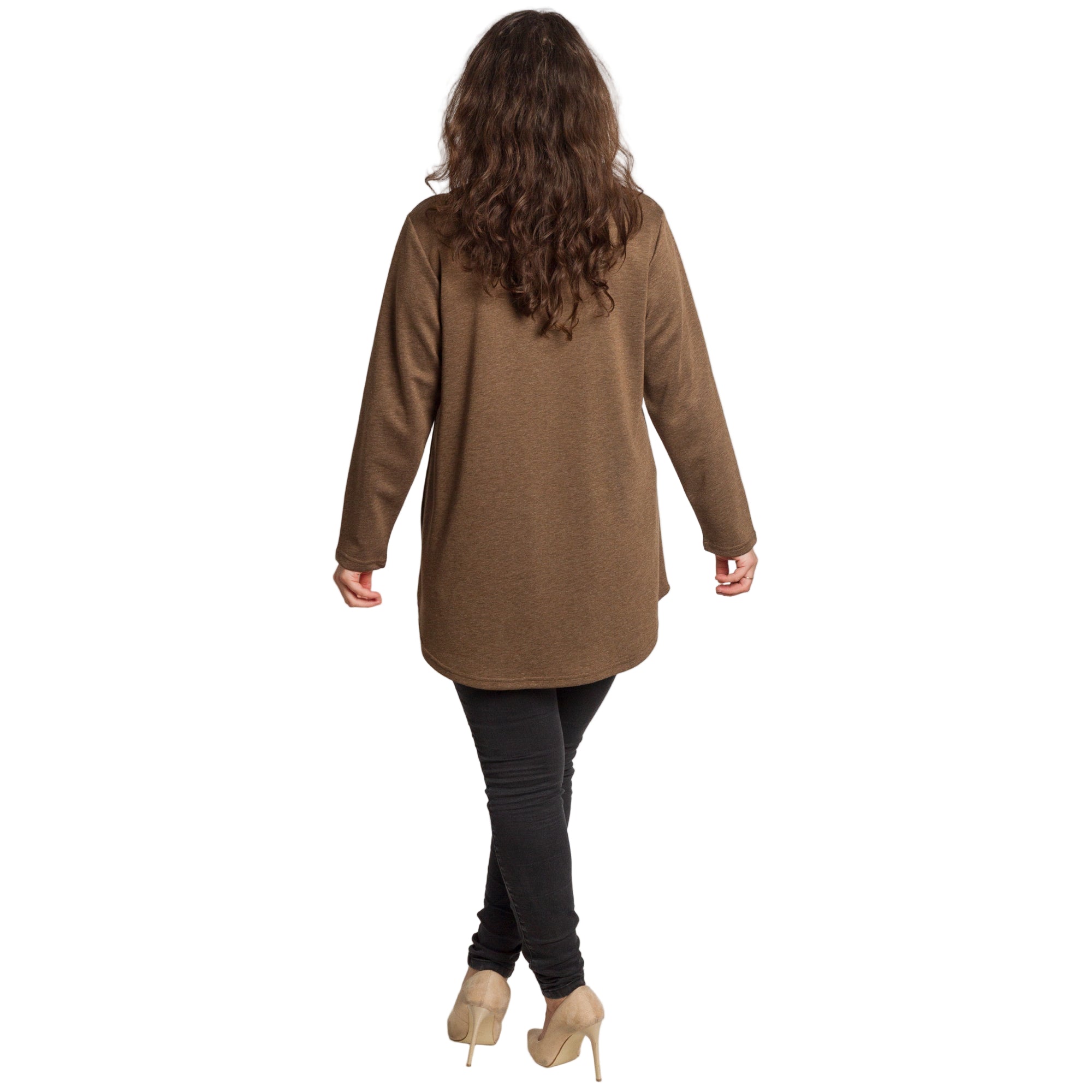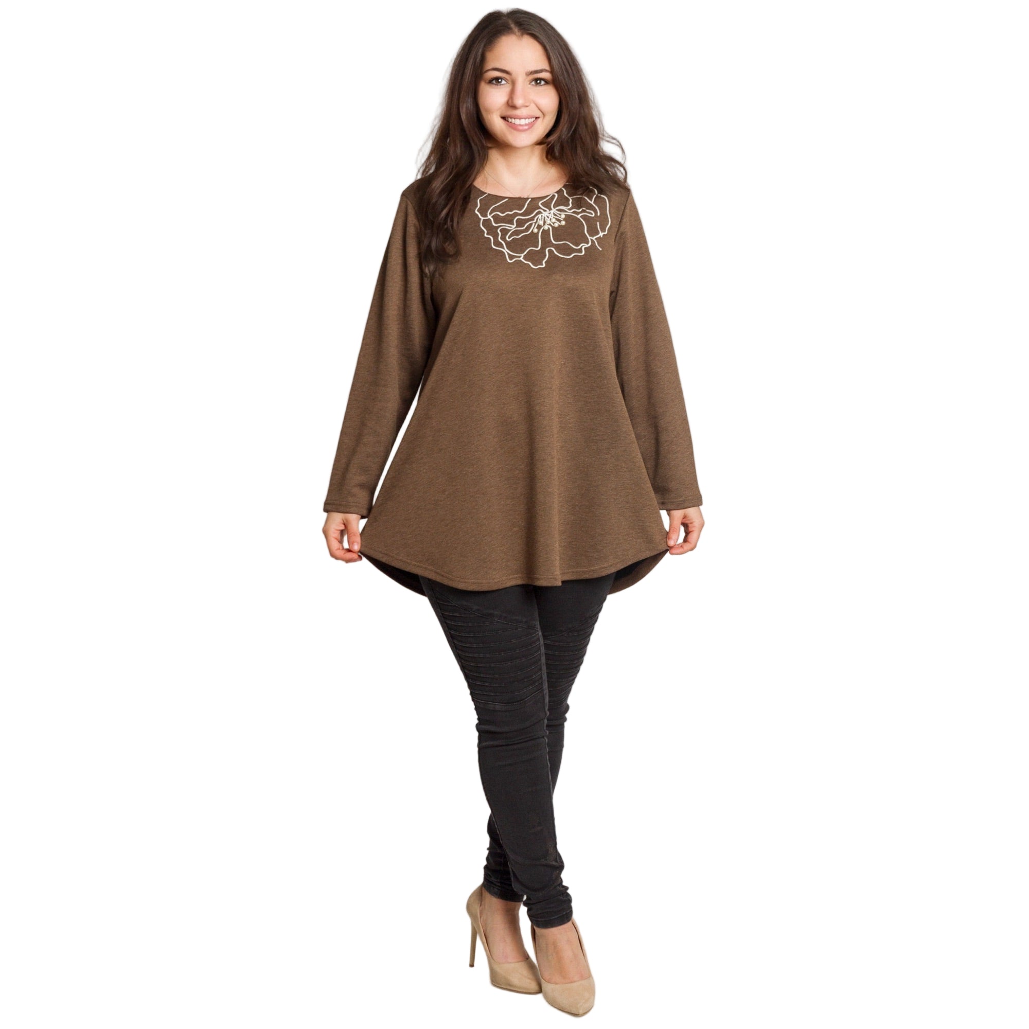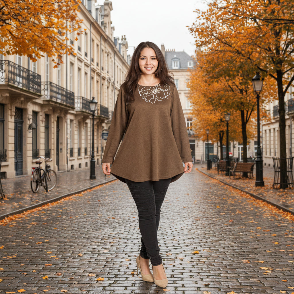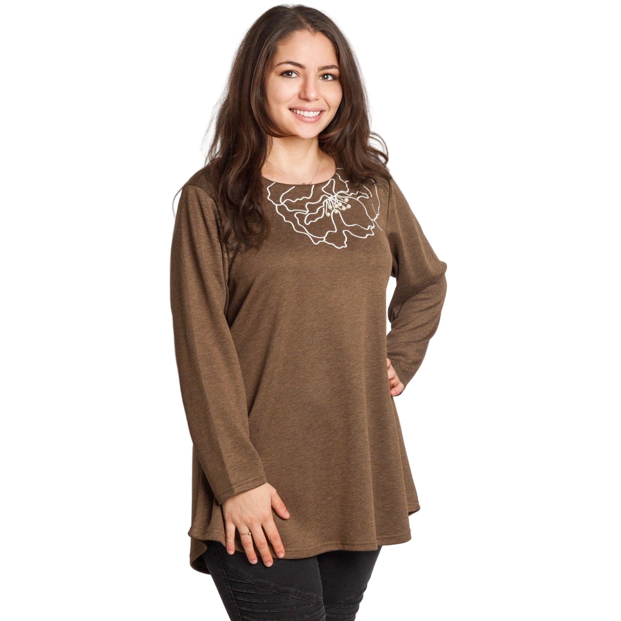 Καφέ άνετη τουνίκ με φλοράλ κέντημα και πέρλες