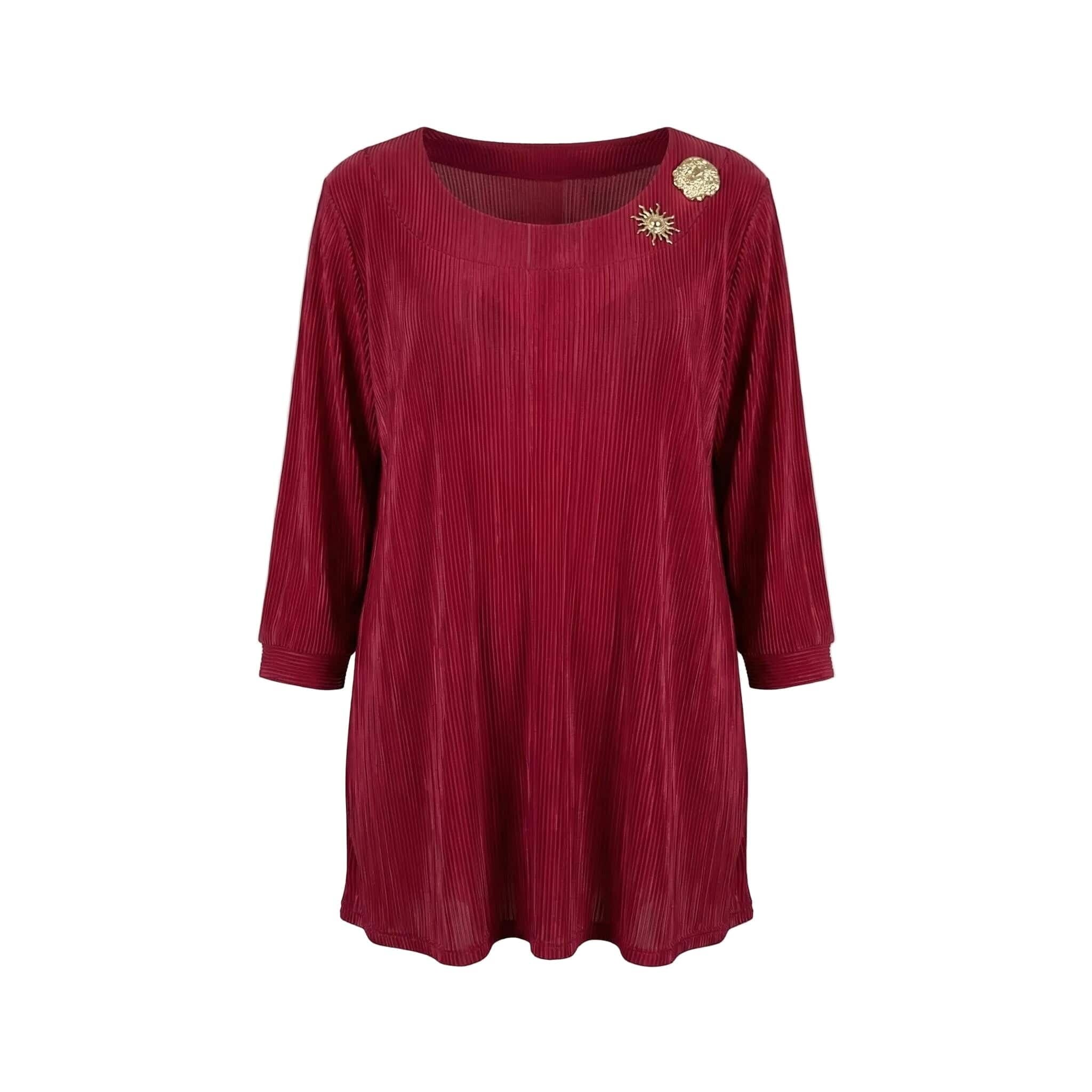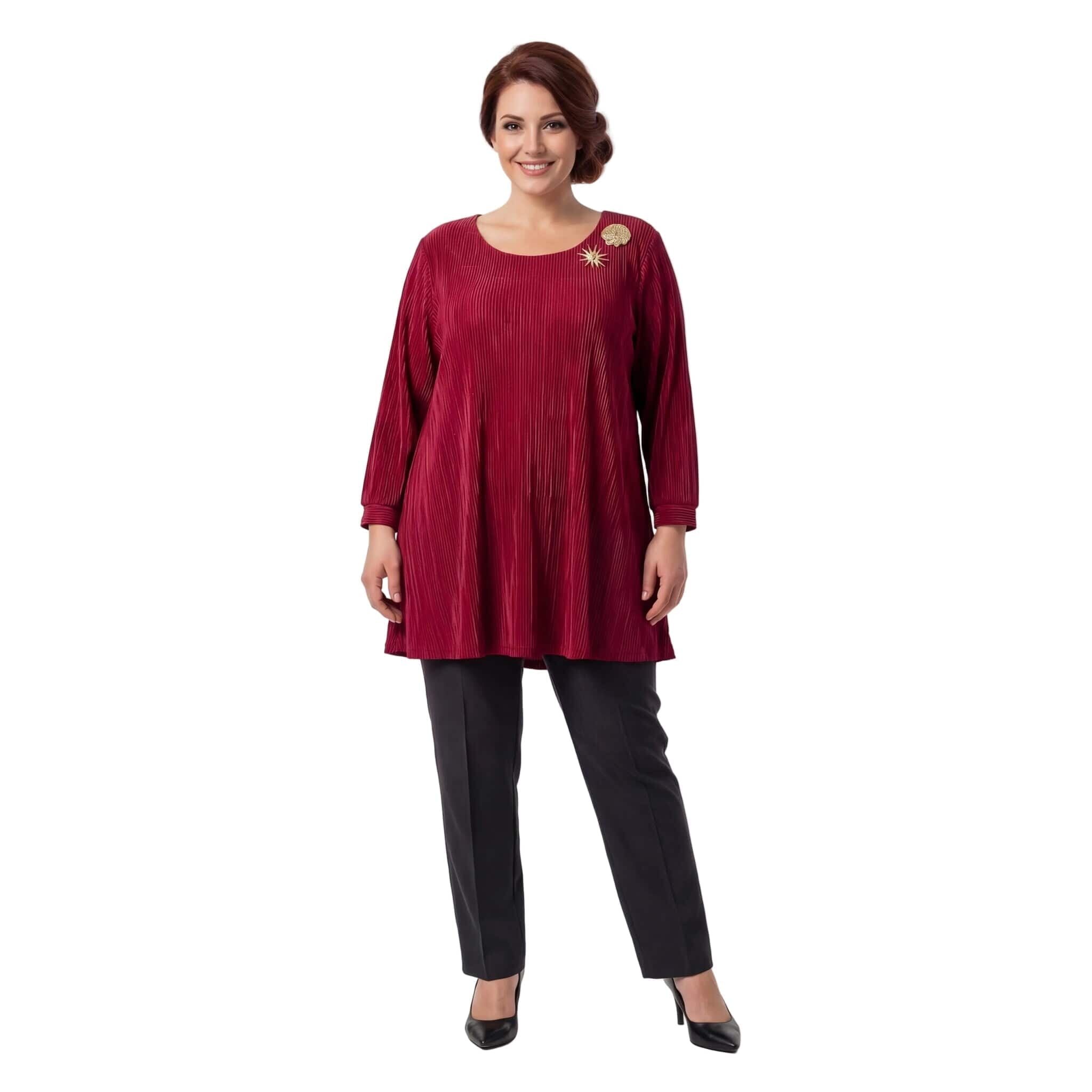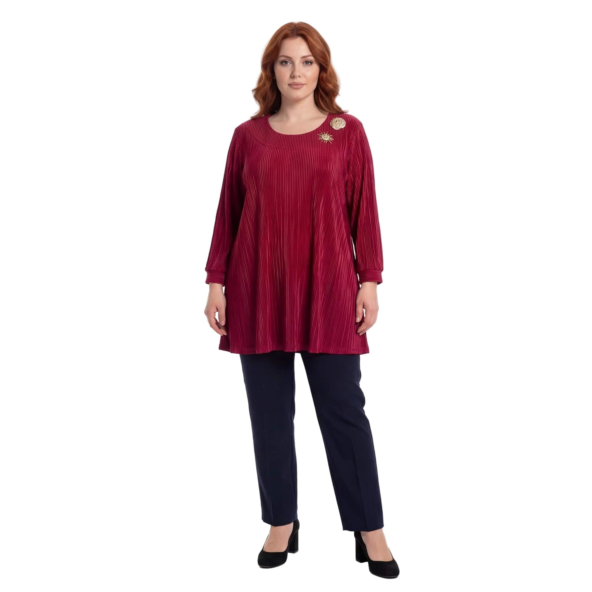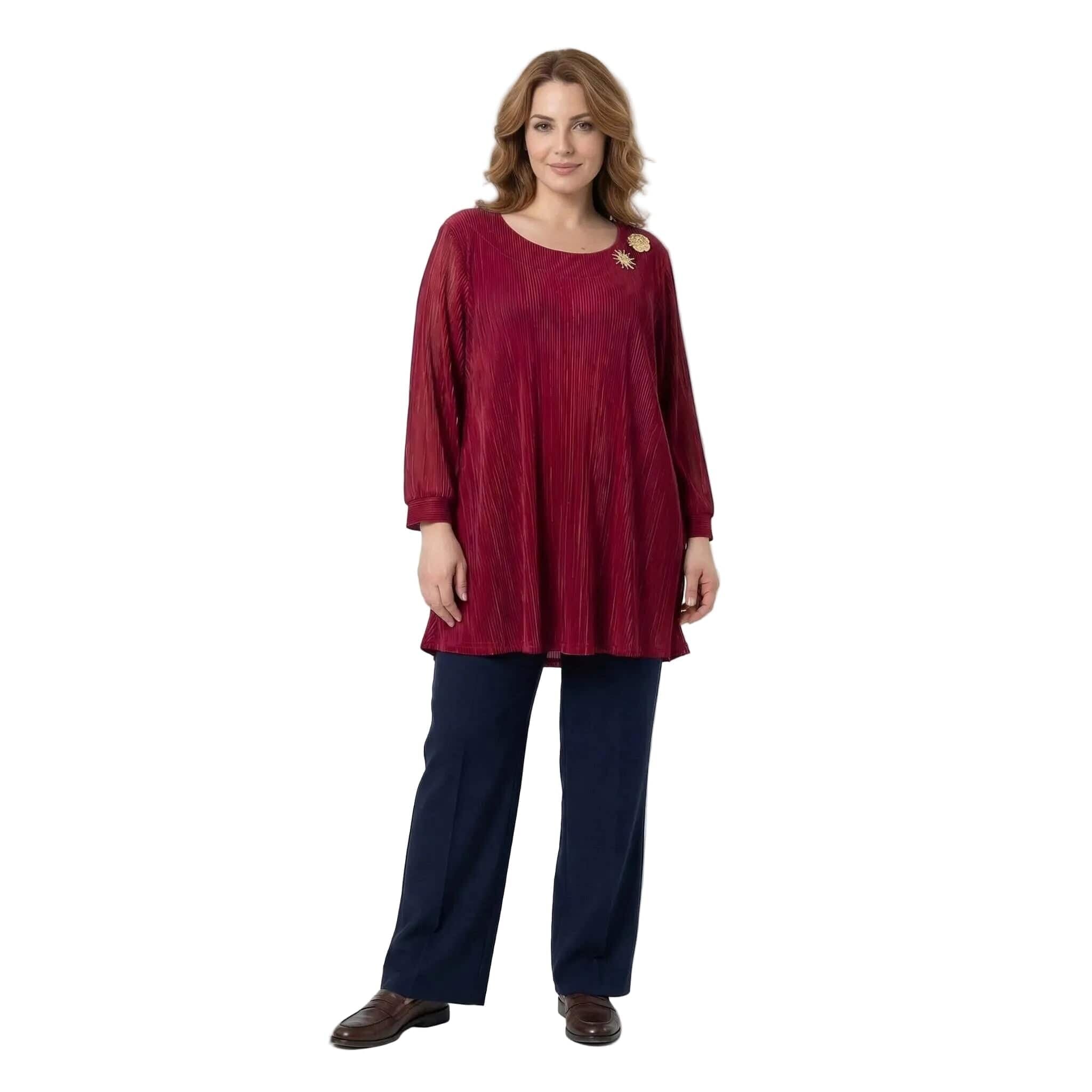Κομψή επίσημη κόκκινη τουνίκ σε μεγάλα μεγέθη με όμορφες καρφίτσες