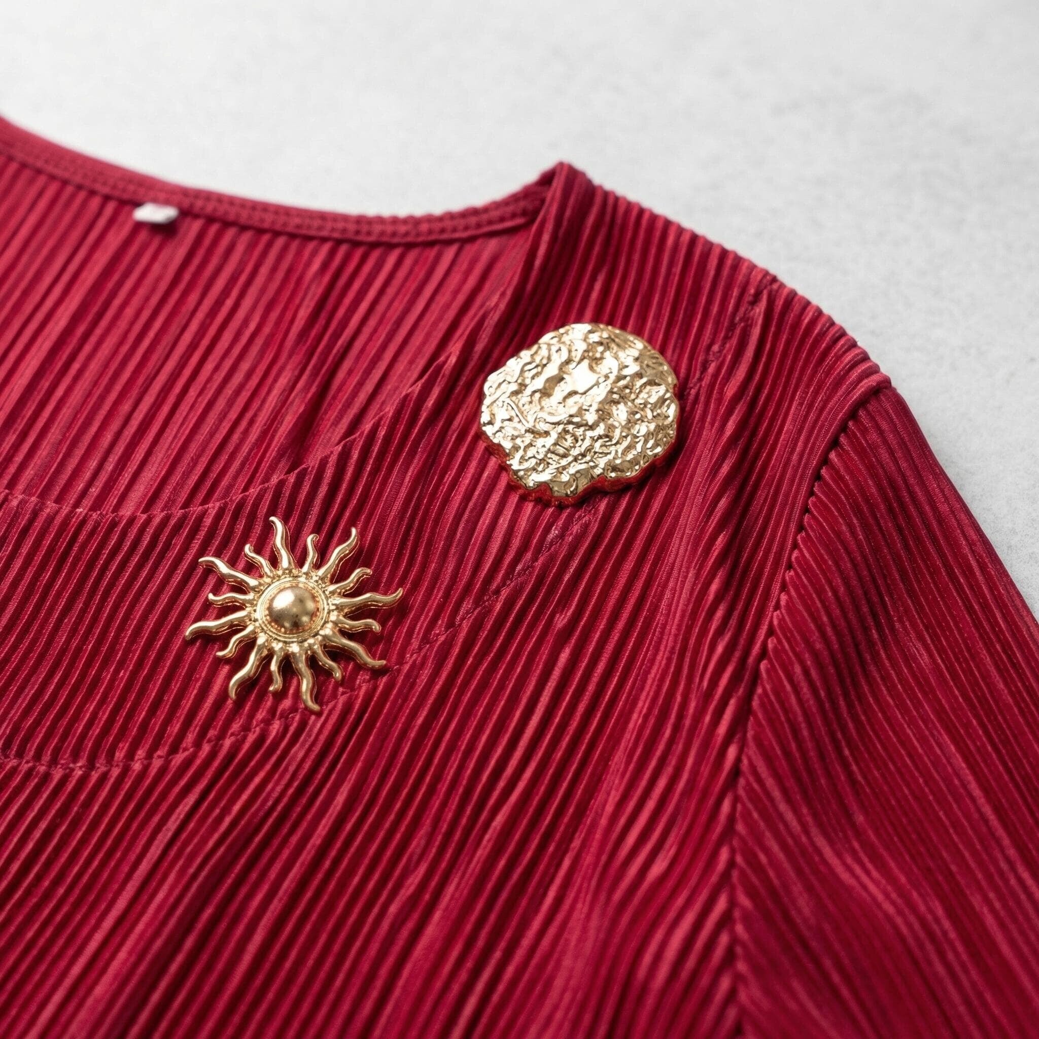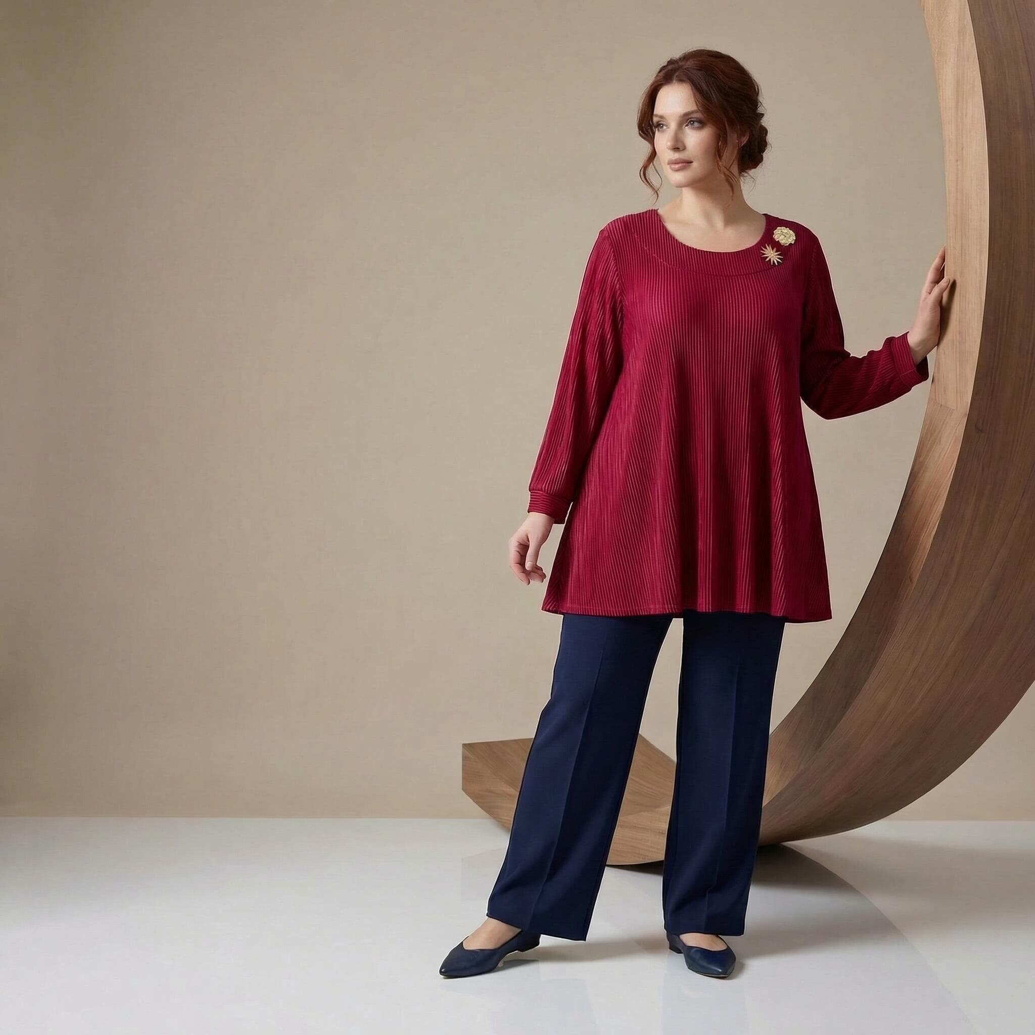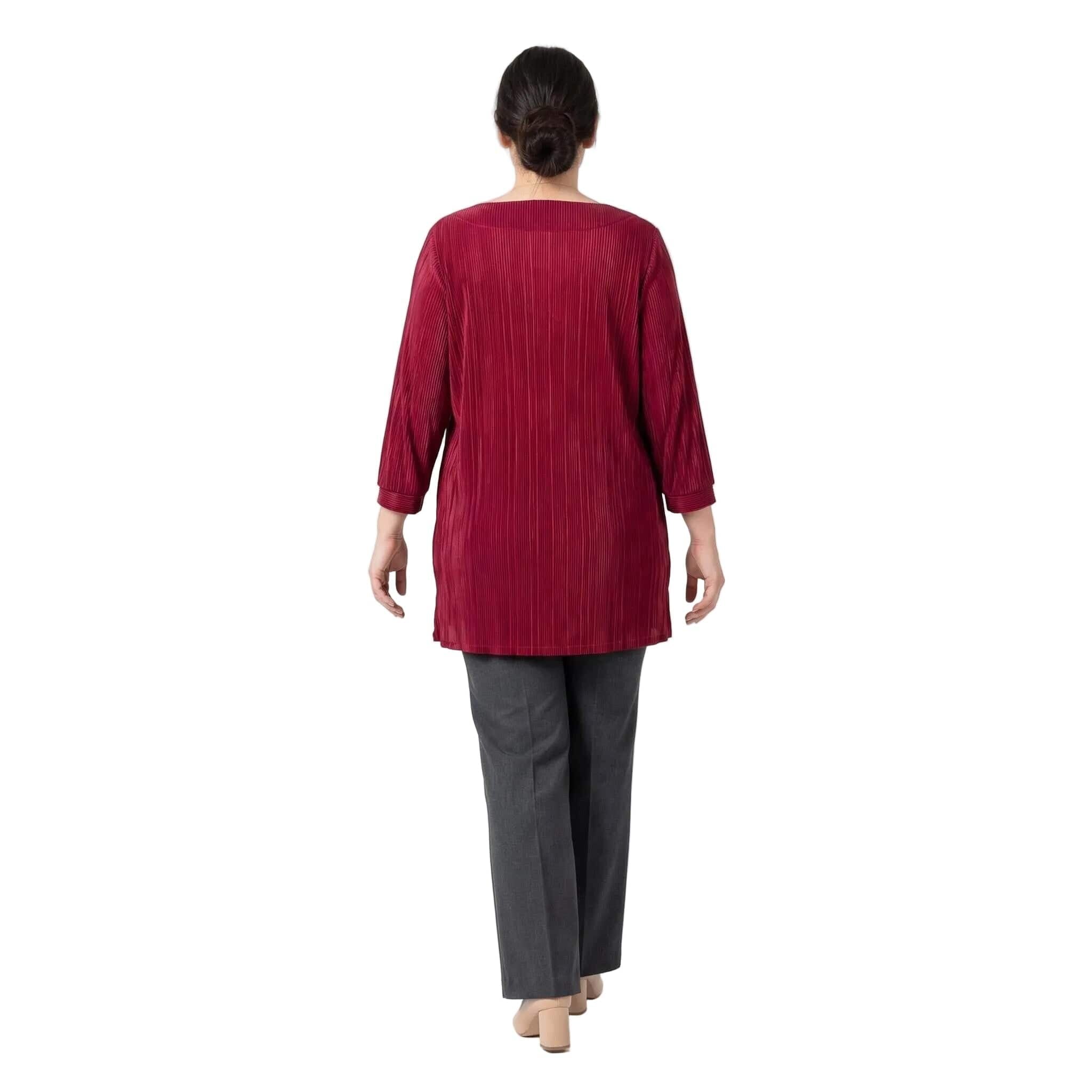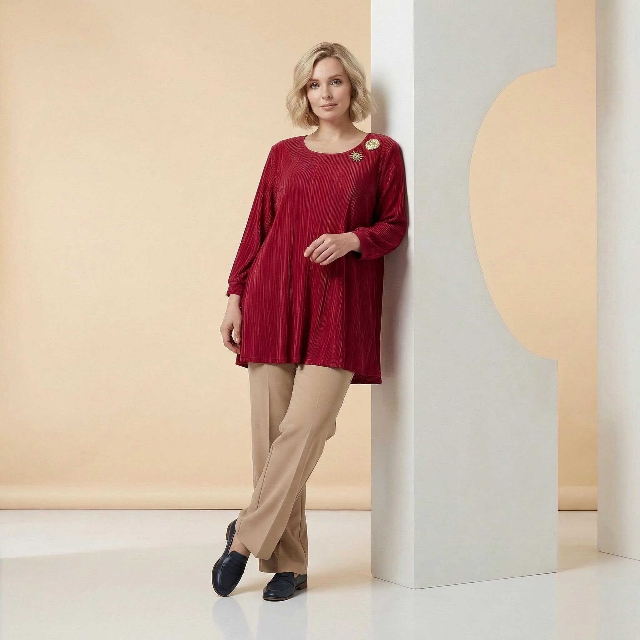 Κομψή επίσημη κόκκινη τουνίκ σε μεγάλα μεγέθη με όμορφες καρφίτσες