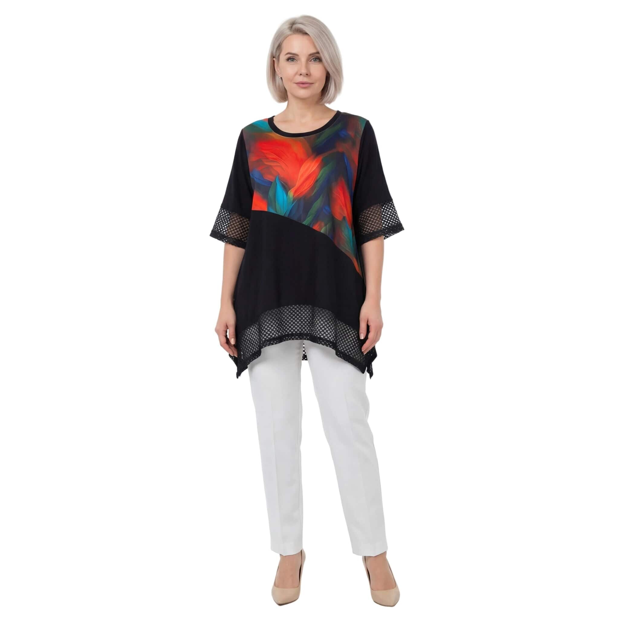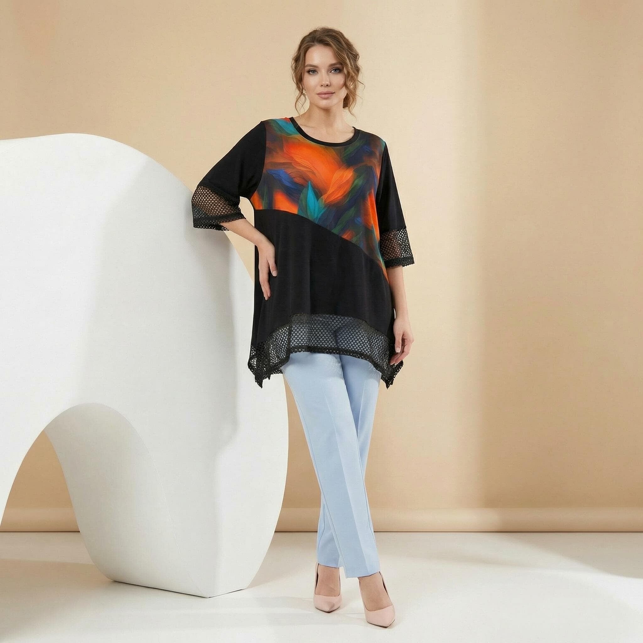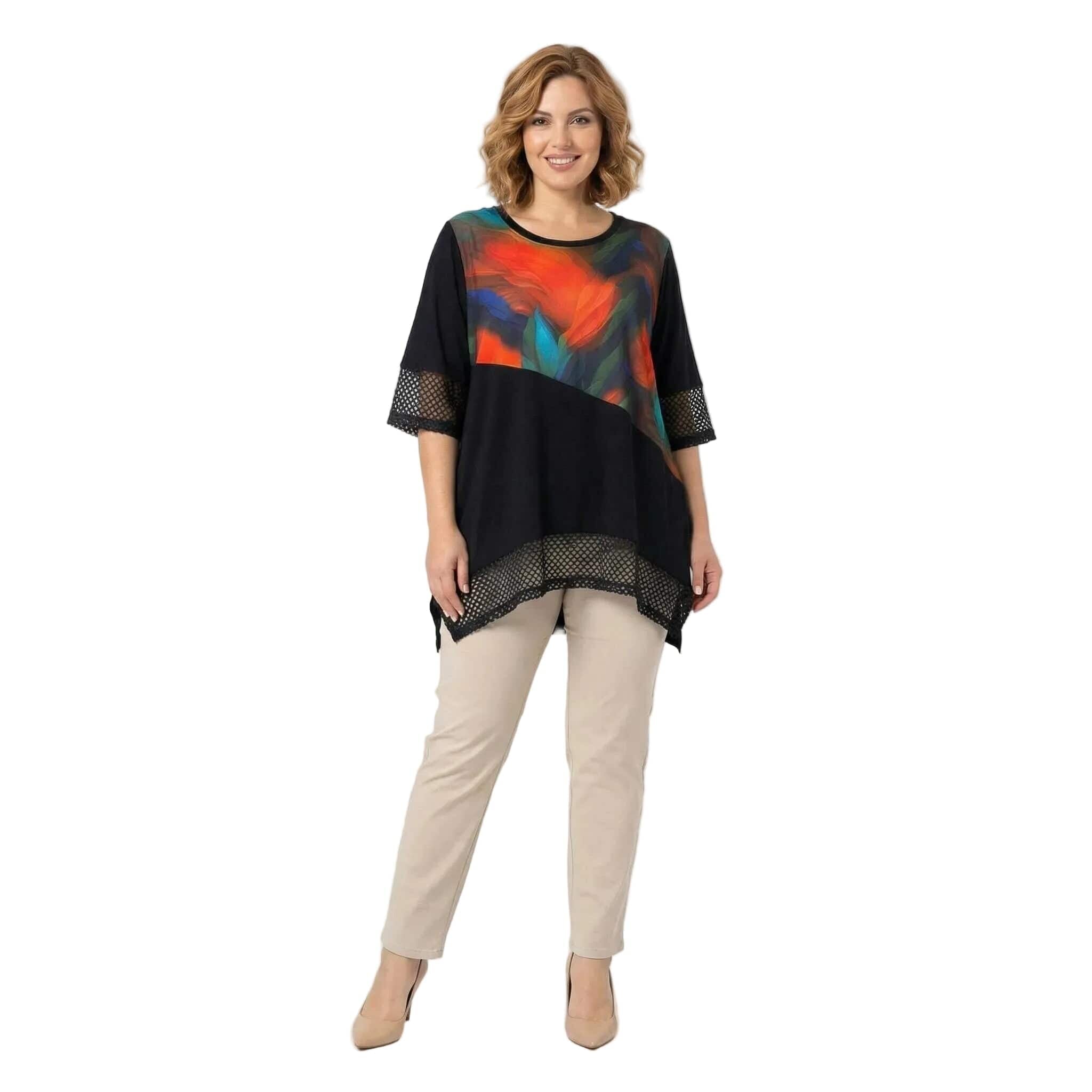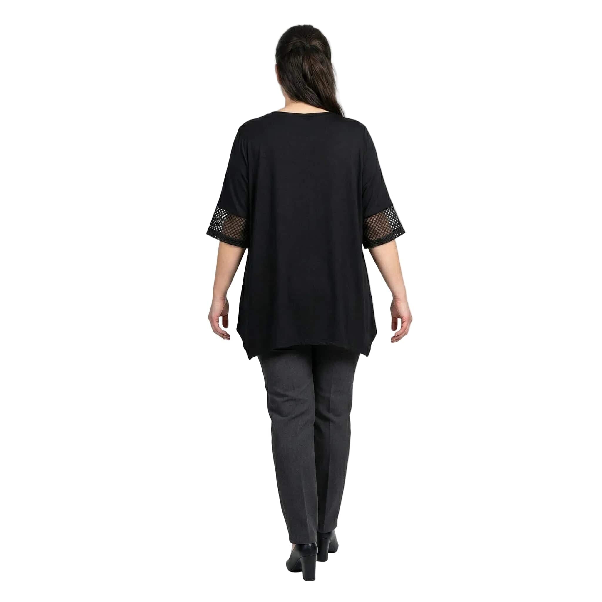 Μαύρη επίσημη τουνίκ σε μεγάλα μεγέθη με δίχτυ και ασύμμετρη γραμμή