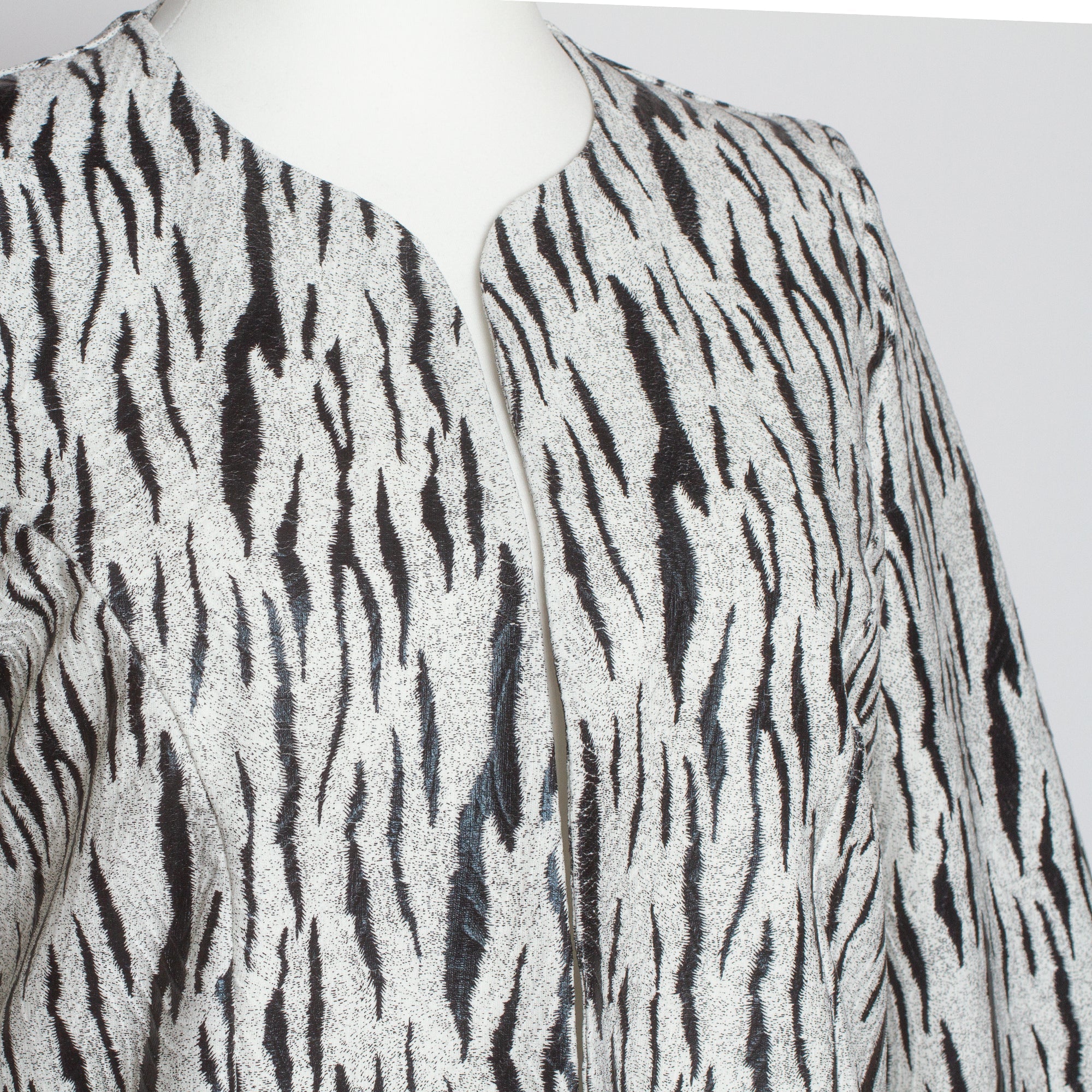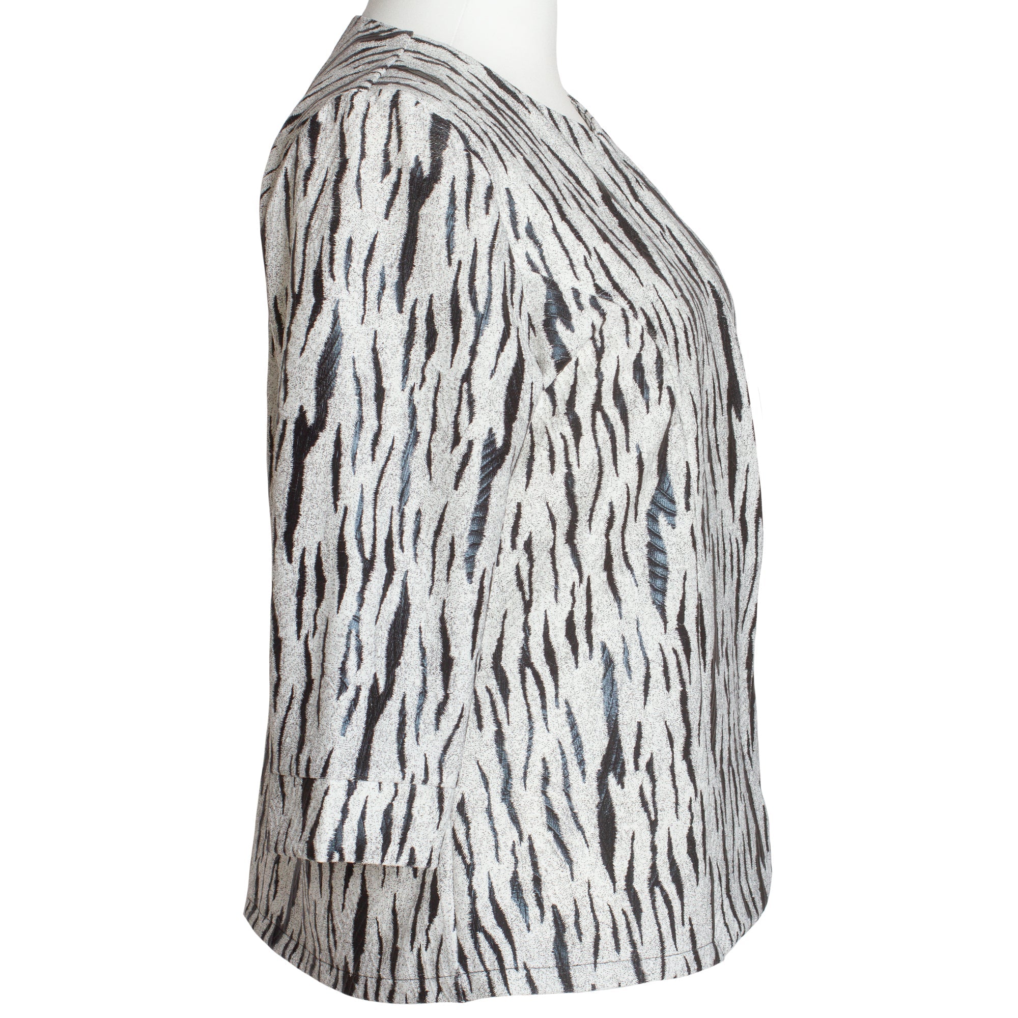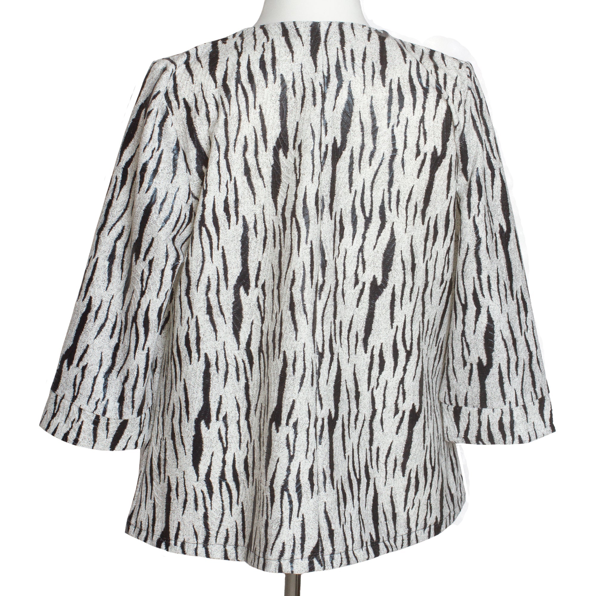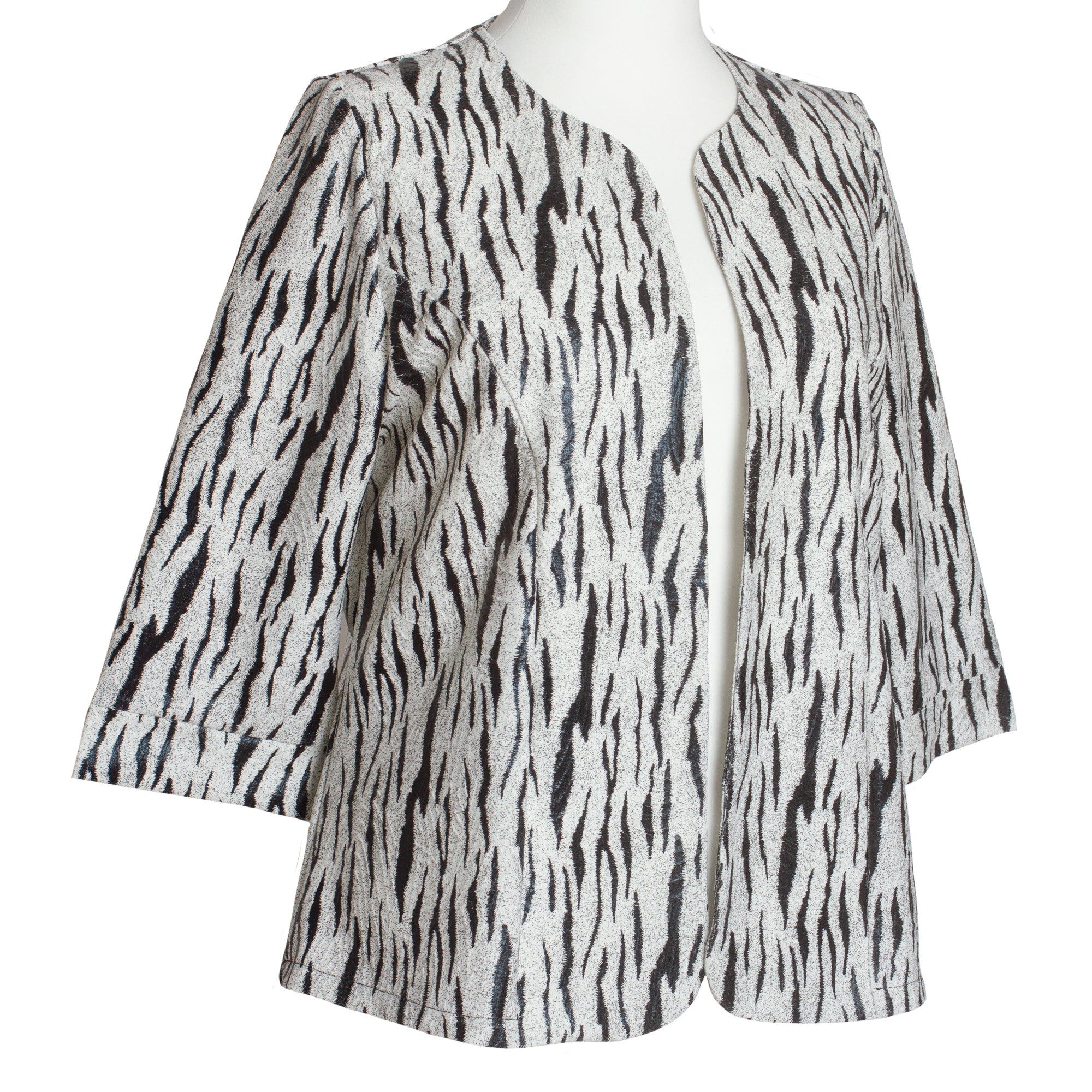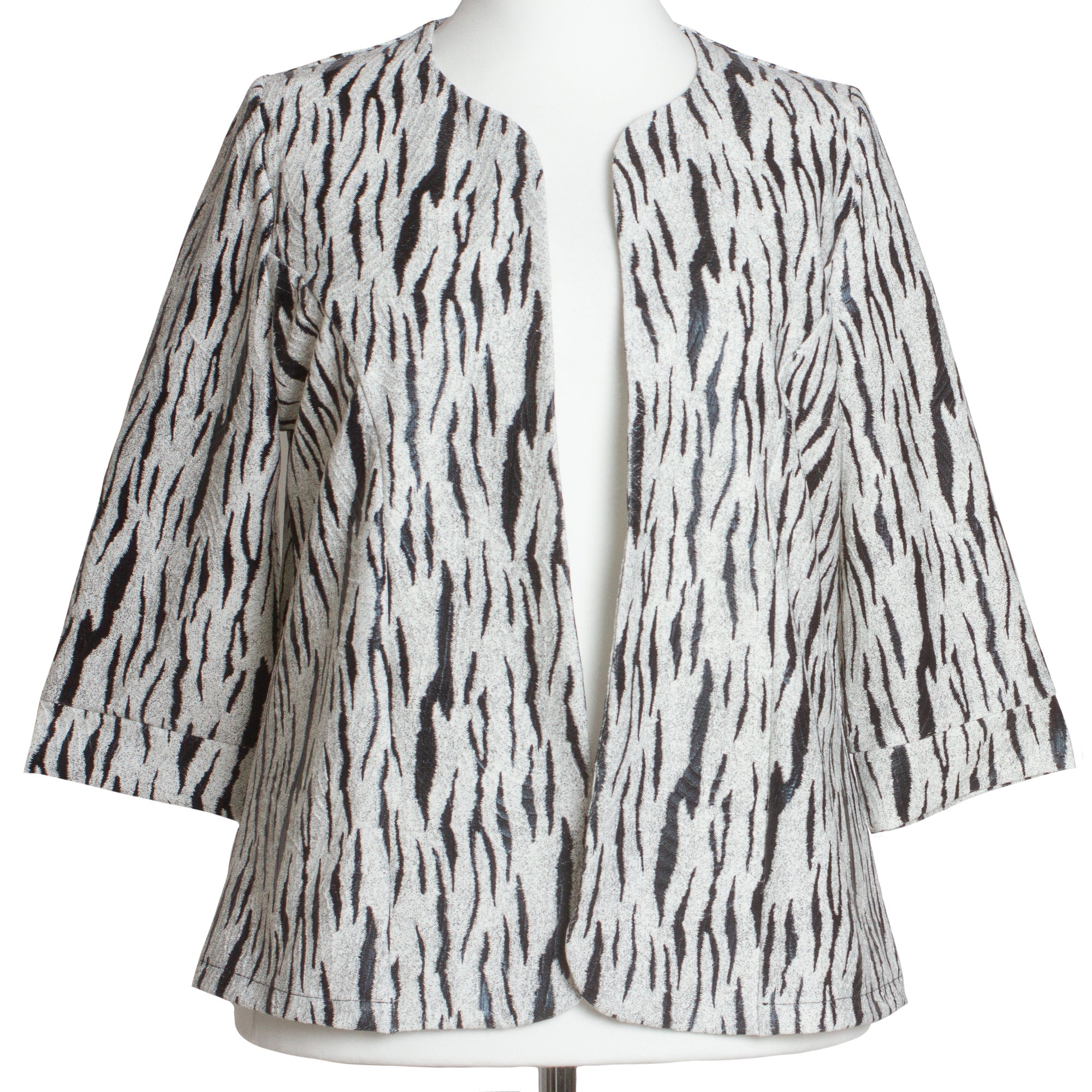 Κομψό σακάκι σε μεγάλα μεγέθη, κατασκευασμένο από υψηλής ποιότητας ύφασμα με εντυπωσιακό animal print σε αποχρώσεις μαύρου και γκρι. Ο σχεδιασμός είναι σε χαλαρή γραμμή που προσφέρει άνεση και ευελιξία στην κίνηση, ενώ τα 3/4 μανίκια χαρίζουν μοντέρνο στυλ. Το σακάκι είναι ανοιχτό χωρίς κουμπιά, γεγονός που το καθιστά εύκολο να συνδυαστεί με διάφορα outfit – από casual έως πιο επίσημα. Κατάλληλο για την εποχή φθινόπωρο-χειμώνα, αποτελεί ιδανική επιλογή για μια κομψή και δυναμική εμφάνιση.