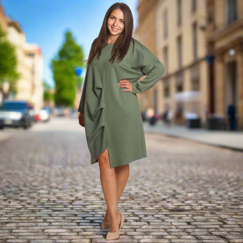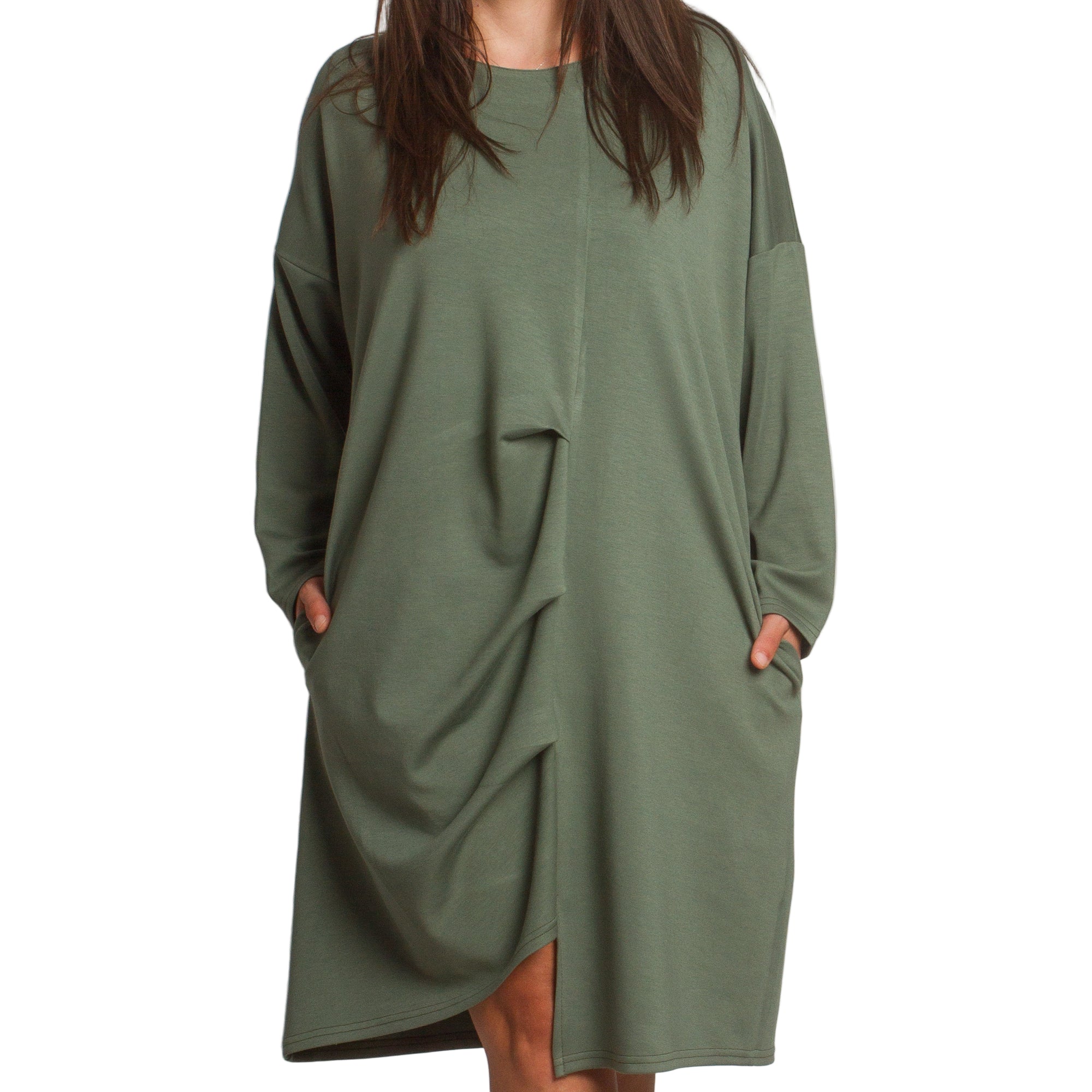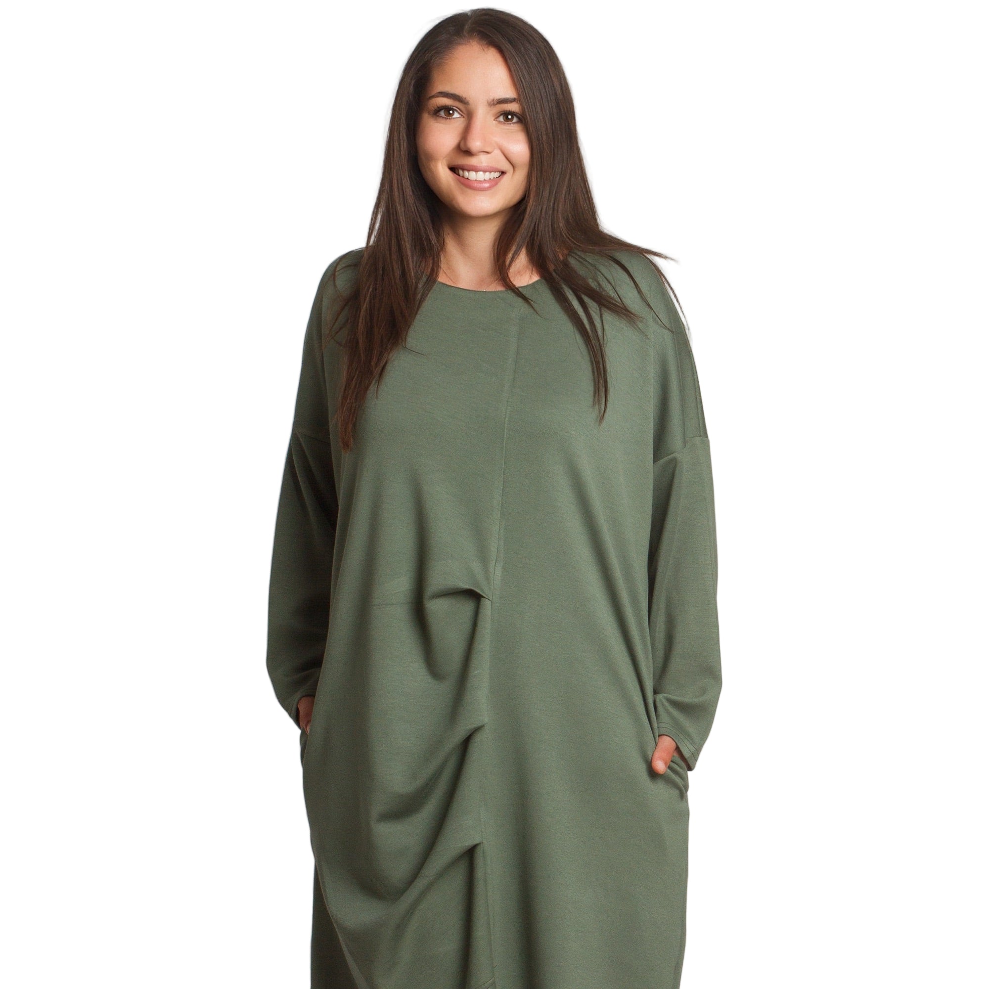 Χαλαρό πράσινο φόρεμα με τσέπες και ασύμμετρες πιέτες